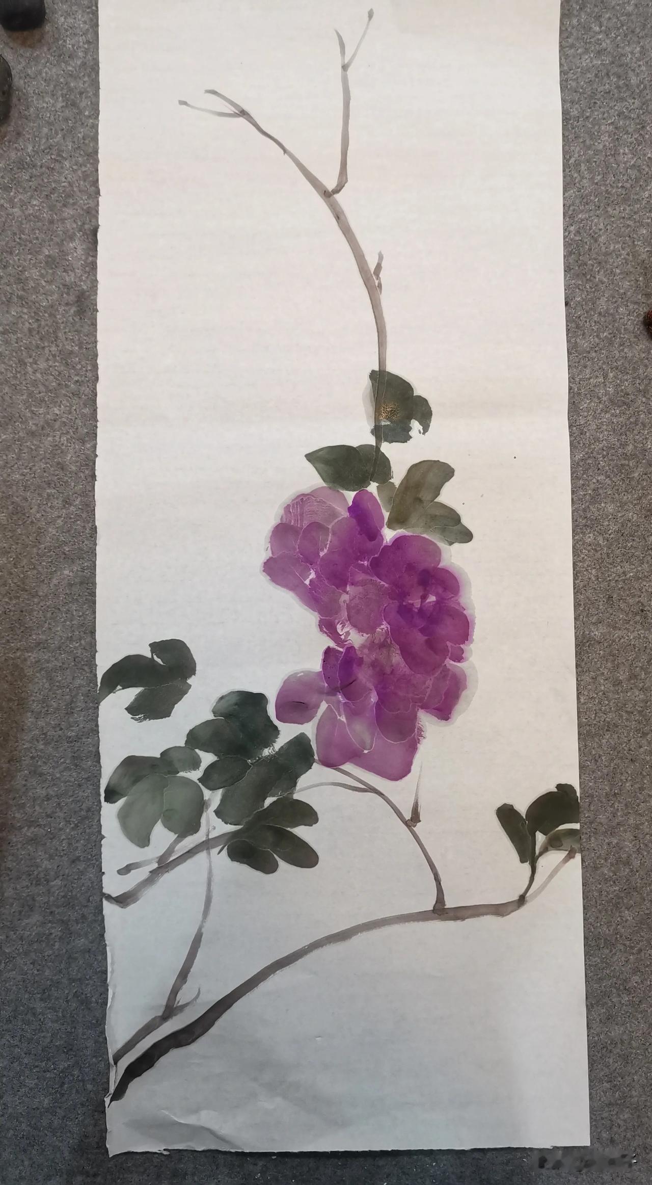 何人不爱牡丹花 占断城中好物华 书写落款时,发现漏写了“人”字,没法补上,就这样吧,读起来也是很通顺:何不爱牡丹花,占断城中好物华,别有一番意韵。 图6,老师点评作业时帮加了几笔,这样就更符合画理了,这是最近,我很喜欢的一张小画。