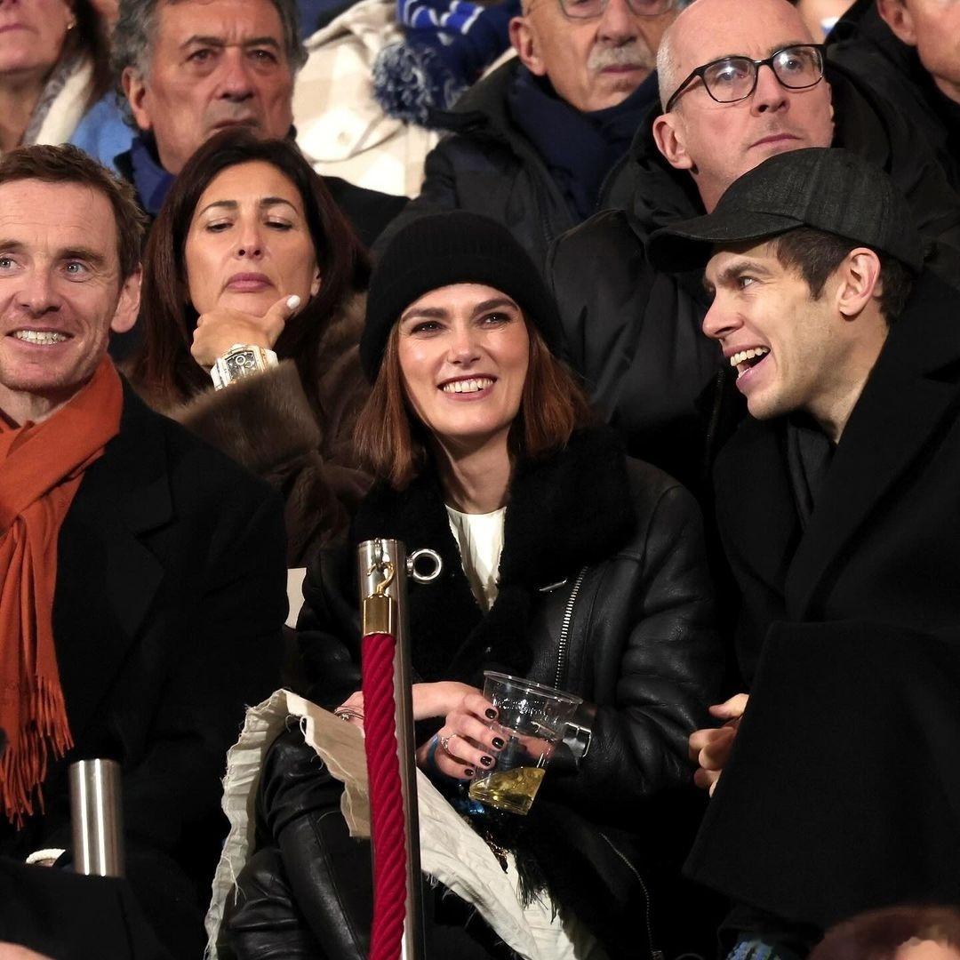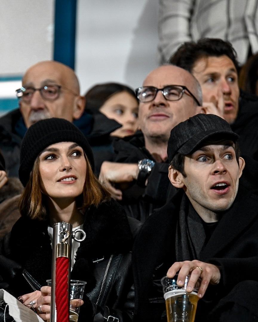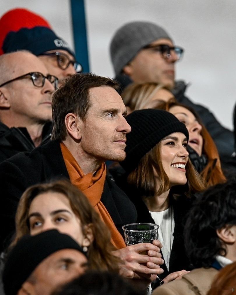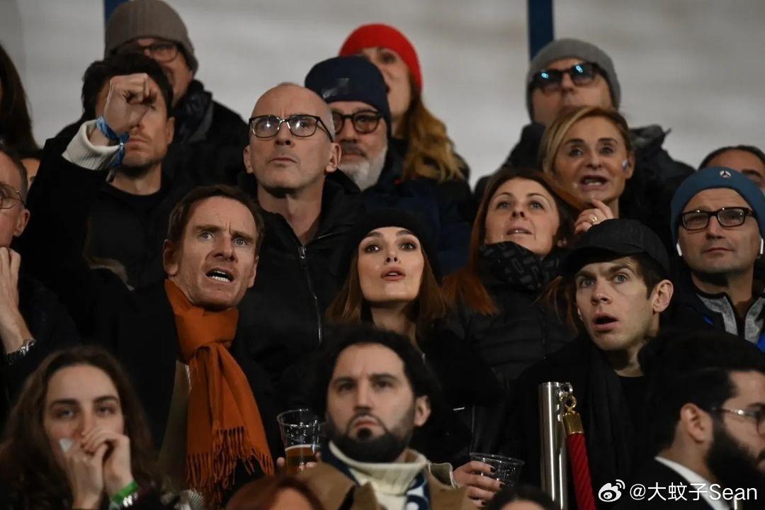 Keira Knightley 凯拉奈特莉和老公James Righton詹姆斯莱顿,还有好友Michael Fassbender一起在意大利科莫观看足球比赛,进球时三人随观众席起身欢呼
