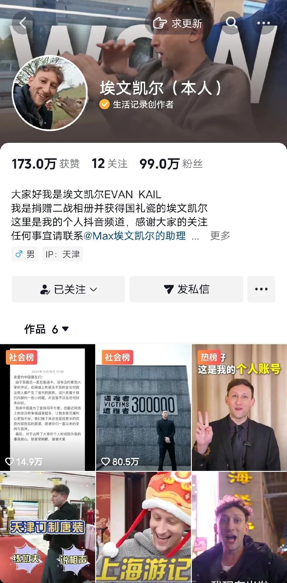 本来不想继续发埃文凯尔的新闻了,怕蹭热度。但还得再说一次。首先新号短短几天,马上破百万了,祝贺埃文凯尔,我们中国人的朋友。 要强调一个问题,人多嘴杂,居然有人说埃文凯尔是来捞钱,什么因为钱产生纠纷,可恶至极。首先国礼瓷,代表国家对埃文凯尔的认可和尊重,国礼待之。 回头再说,他来创业,他来赚钱又能怎样?他不应该吗,不值得吗?国礼瓷不是随便给的,且获得国礼瓷且在世的只有埃文凯尔。这一次感动的不是几个人,是整个中华民族,相册穿越历史,让14亿人能够亲眼目睹历史,且埃文凯尔的示范效应,会让更多的日本罪行,在尘封80多年后,陆续解封公诸于世。我们新中国后成长的几代人,没有经历那段历史。只有80多岁的老人,才有记忆。有爷爷奶奶,太爷爷太奶奶在世的,多沟通,多了解那段历史吧。我从80多岁的奶奶口中得到的,只有两个字,恐怖。就是害怕的身影,伴随着他们的童年。现在,上个世纪,30年代出生或者成长的人越来越少了,经历那场苦难的人更少了。尤其当下的青少年,这些真实记录的历史资料,是最真最直观的史实无价之宝。所以我才说,埃文凯尔有示范效应,我们应该更珍惜埃文凯尔的行动。在埃文凯尔之后,我们已经看到了一些要捐助抗战资料的外国人。他们都是当时生活在中国的外国友人的后代。当然了,这里我们需要分辨,尤其国内自媒体发布的视频。要分辨外国友人本人才值得关心关注。因为资本什么题材都会炒。这个民族大义,也不会放过。我们要尊重的,一定是捐赠资料的所有权者,一定是真正的捐赠者本人。而不是国内自媒体,自媒体公司团体。 所以,未来我们要分清楚,不要被机构利用捐赠话题带着走。就像埃文凯尔,我们知道了哪个是本人,那就关注本人。因为埃文凯尔值得尊敬。 在98.8万截图,发发,希望埃文凯尔在中国的事业。红红火火,发发发,因为埃文凯尔赚钱没毛病啊。他是民族大义者,得到了国家礼遇,国人支持。为何不能来赚钱。 在99万截图,久久,希望埃文凯尔长留中国,友谊长长久久,中美的桥梁和平久久,真爱可以永久。 未来还有更多的埃文凯尔,但大家记住,分清楚本人,在刷礼物。不要把过度的关注和礼物给了个人机构。。。
