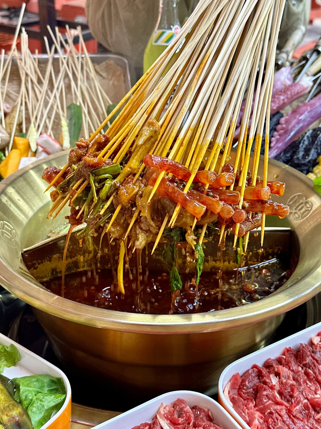 谁还没吃过这家串串,我真的会哭!!就在后湖!已经N➕1涮了!!一定要早点去,要不排队排到怀疑人生!几个大双开门冰柜摆满了各种荤素串串,竹签才0.59r,吃再多也不心疼👛还有那种chao大串,长腿章鱼、海参、酥肉、大块牛筋,大口吃好过瘾! 盘装的鲜切的吊龙、麻辣牛肉、纯手搓肉丸子、千丝蟹柳…根本吃不过来! 地道重庆味辣锅里面涮一哈,不用沾酱都jujujuju好吃!真神仙锅底!!谁懂!每次都是撑到嗓子眼才舍得走🥹