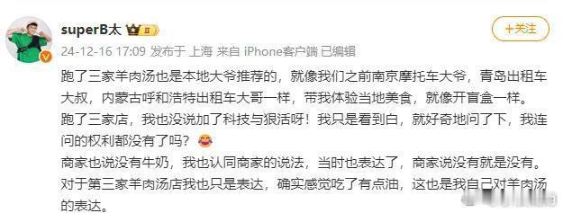 东北雨姐红的时候说东北雨姐很真实的,是不是B太?东北雨姐塌房了,狡辩说自己被“网红”骗了是不是他?翻脸比翻书还快。菏泽羊肉汤的事,他不知道羊肉汤大火熬白乱吐槽,怎么,网友还说不得了?他是神?说啥就是啥?扯犊子呢。他先是引导力“怎么会有这么白的汤”,没想到网友不吃这一套,怼他了。然后一看不是事,最新微博就又发挥东北雨姐塌房后的狡辩,“我没有说是科技与狠活,就是弱弱问一下为什么那么白,我连问的权利都没有了吗”。乐!把网友当傻子呢?部分粉丝差不多得了,没谁是万能的,公众人物,网友连就事论事点评一下的权利都没有了吗?[摊手] B太点评菏泽羊汤太白被网友骂 B太喝菏泽羊汤引发肠胃炎遭质疑