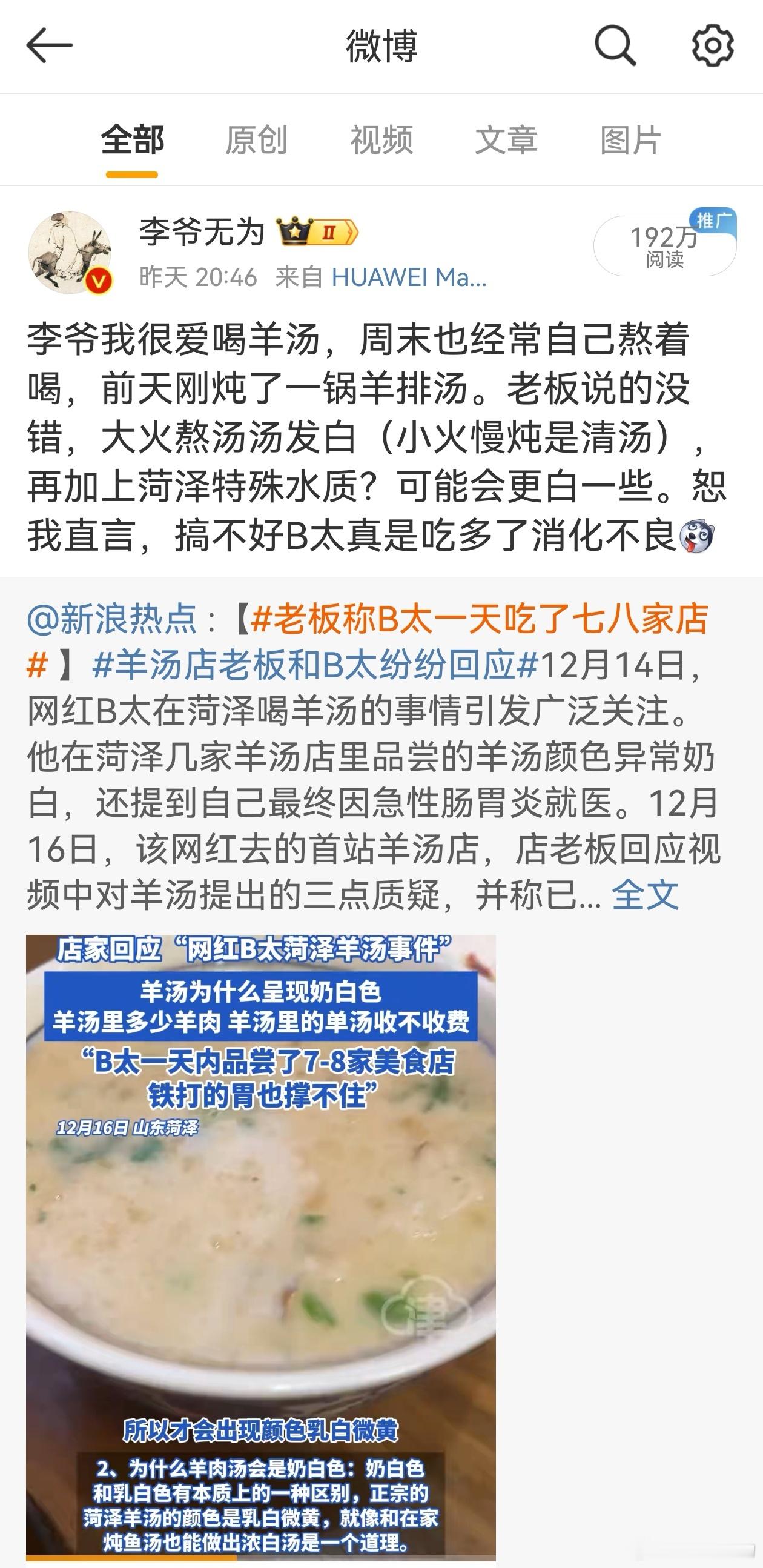 羊汤店老板和B太纷纷回应 【打假博主质疑菏泽羊汤太白引争议,双方回应】 老板称B太一天吃了七八家店 B太谁啊?一部分粉丝是不是有病,还说不得了?有什么毛病,李爷我根据生活常识说了几句,部分粉丝没完没了了。那咱就掰扯一下。