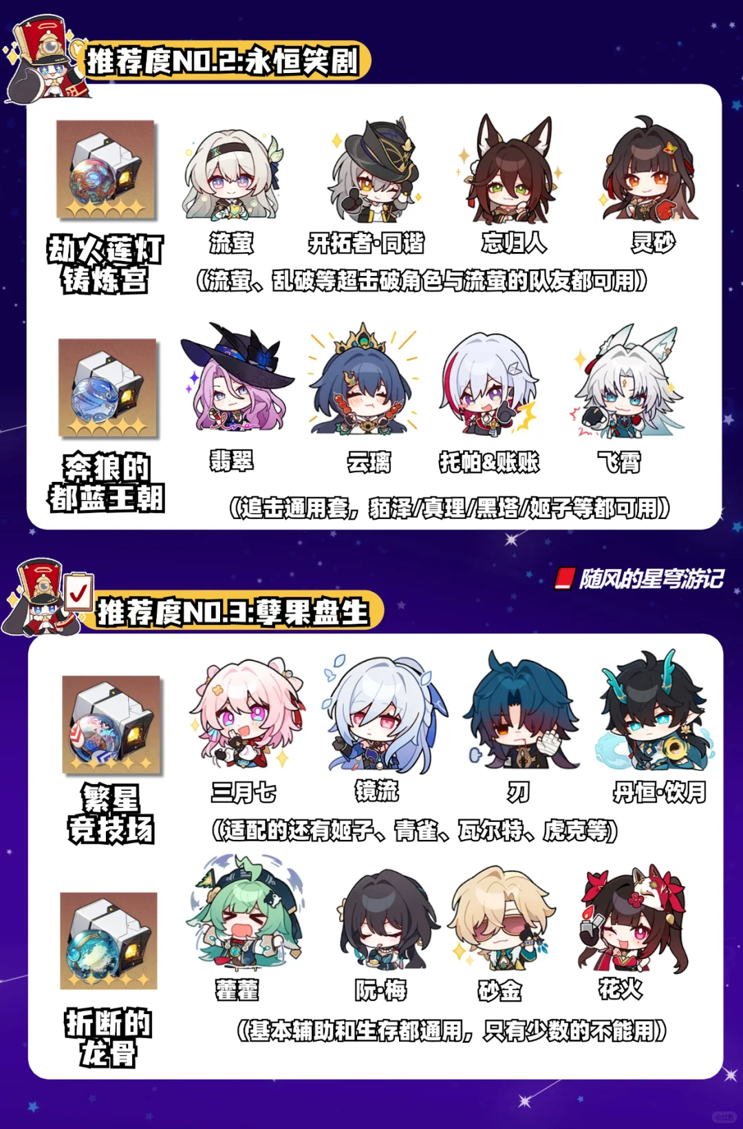 大家早上中午晚上好,我是随风 周三(12月18日)位面饰品双倍来啦,2.7版本推荐刷这些本 最推荐刷差分宇宙BOSS蠹役饥肠,星期日和景元的饰品都能在这里刷,而且已知记忆命途都有召唤物,未来必定可期; 第二推荐永恒笑剧,不仅新角色忘归人能用,之前的流萤/翡翠/乱破/云璃/灵砂/飞霄/貊泽等都能用; 第三推荐孽果盘生,比较通用的副本。 基本上住在第一推荐和第二推荐就好,特别是第一个,刷的应该比较少,可以开始为3.0大版本准备了