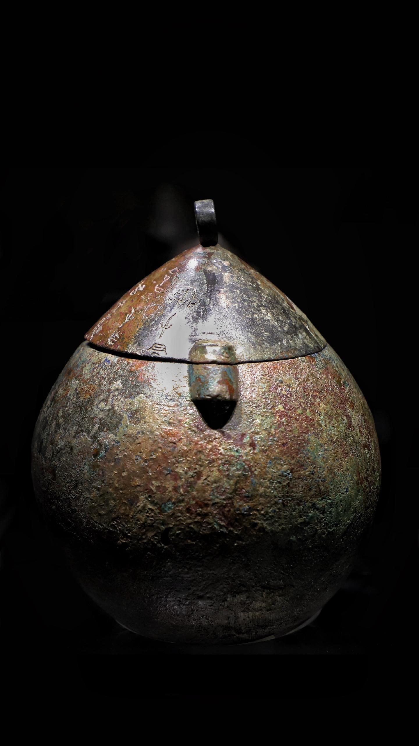 青铜质,子母口,盖器合成一体为竖立的鸟卵形,素面
