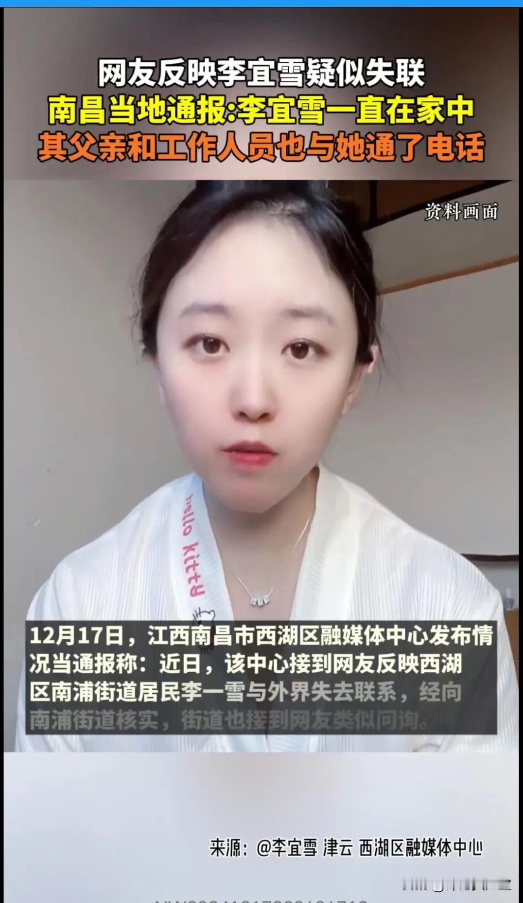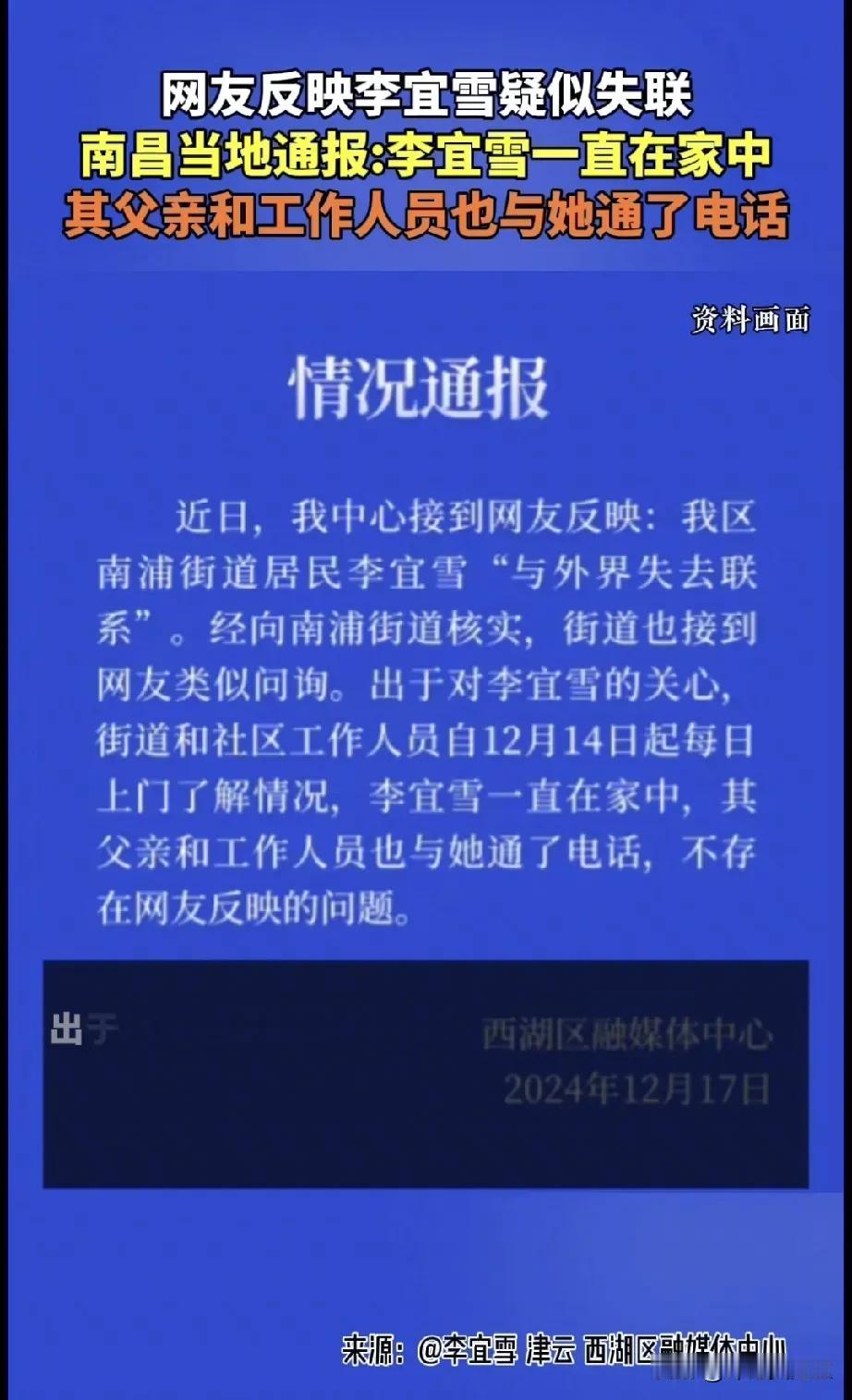 李宜雪最新消息! 据江西南昌西湖区融媒通报称:一直在家中! 那么问题来了:她为啥没对外发视频呢? 不会被断卡了吧?[灵光一闪] 还是不让她对外说话? 我觉得,发这种通报,不如让其本人出发说几句话,她自己就有账号,发个视频,比这种通报更有说服力吧? 这种重大舆情,而其本人发生的事,相当炸裂,难道不该好好调查一番吗? 不要让他们自己查自己,有谁会说自己有错呢? 大家说是吧? 正义有时候想战胜邪恶,确实需要经历一些存折。但光必定会冲破黑暗的乌云!