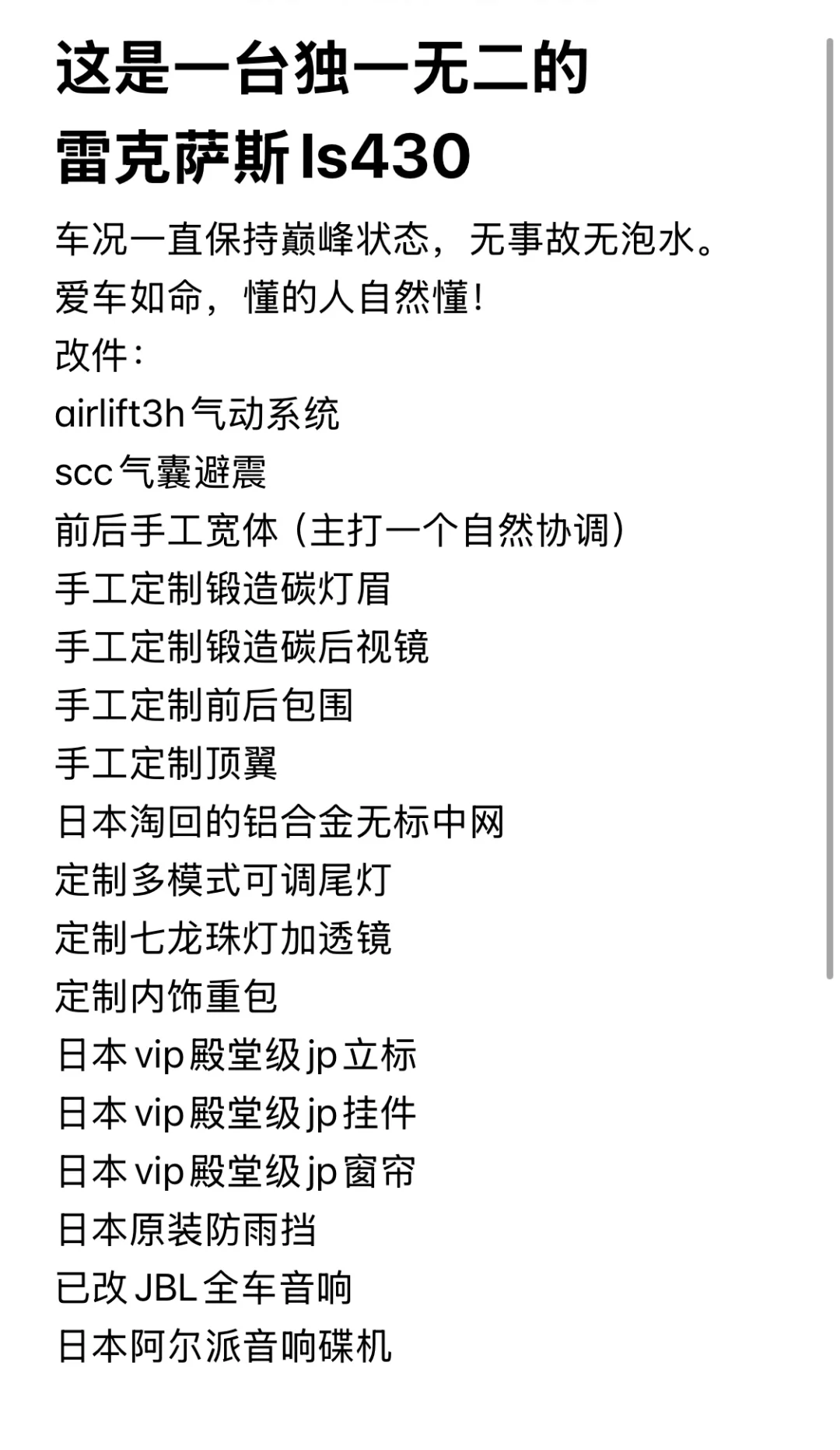 一台开不坏的车,实在找不到卖它的理由。 所以一直保留着这台经典ls430十多年。 现在被迫于车辆太多,只能在户外停放。 对于爱车人来说,车长期停室外等同于毁车。 怪自己无力打理了,只能出售了, 改装费用只能说超乎你想象, 贪便宜的请绕路,等待真正爱车的人接手 有兴趣的朋友嘀嘀我。