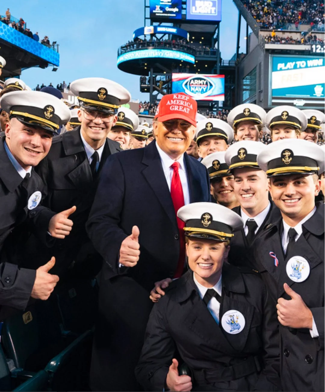 海军橄榄球比赛赛场,川普、副总统万斯和佛州州长德桑蒂斯等等之外,最特别...