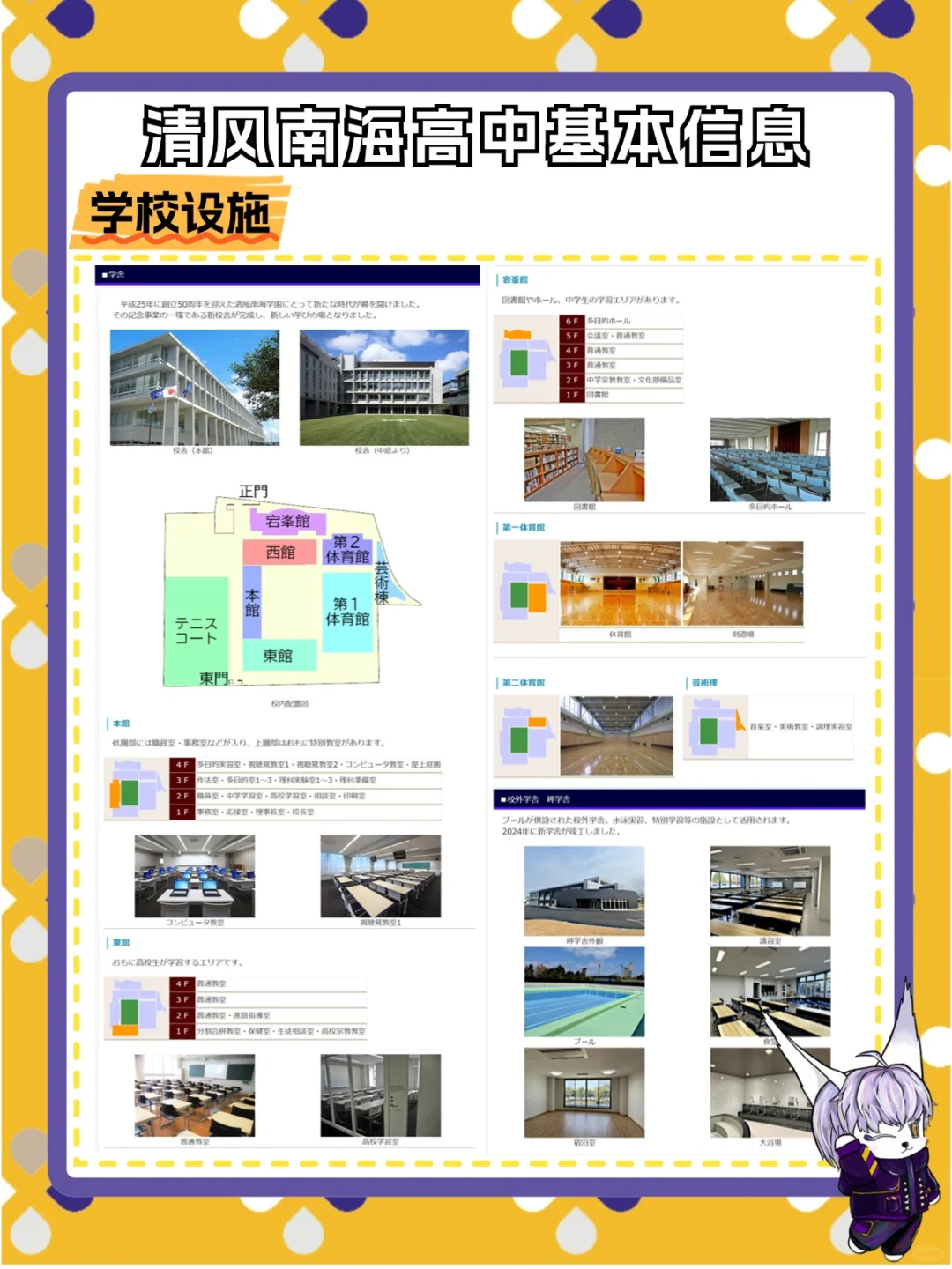 💖礼拜堂(礼堂)、图书馆、多功能教室、研讨教室、校庭、操场、室内泳池、普通教室、自习室等、电脑室、室内体育馆、剑道场、音乐室、美术室、游泳池、食堂