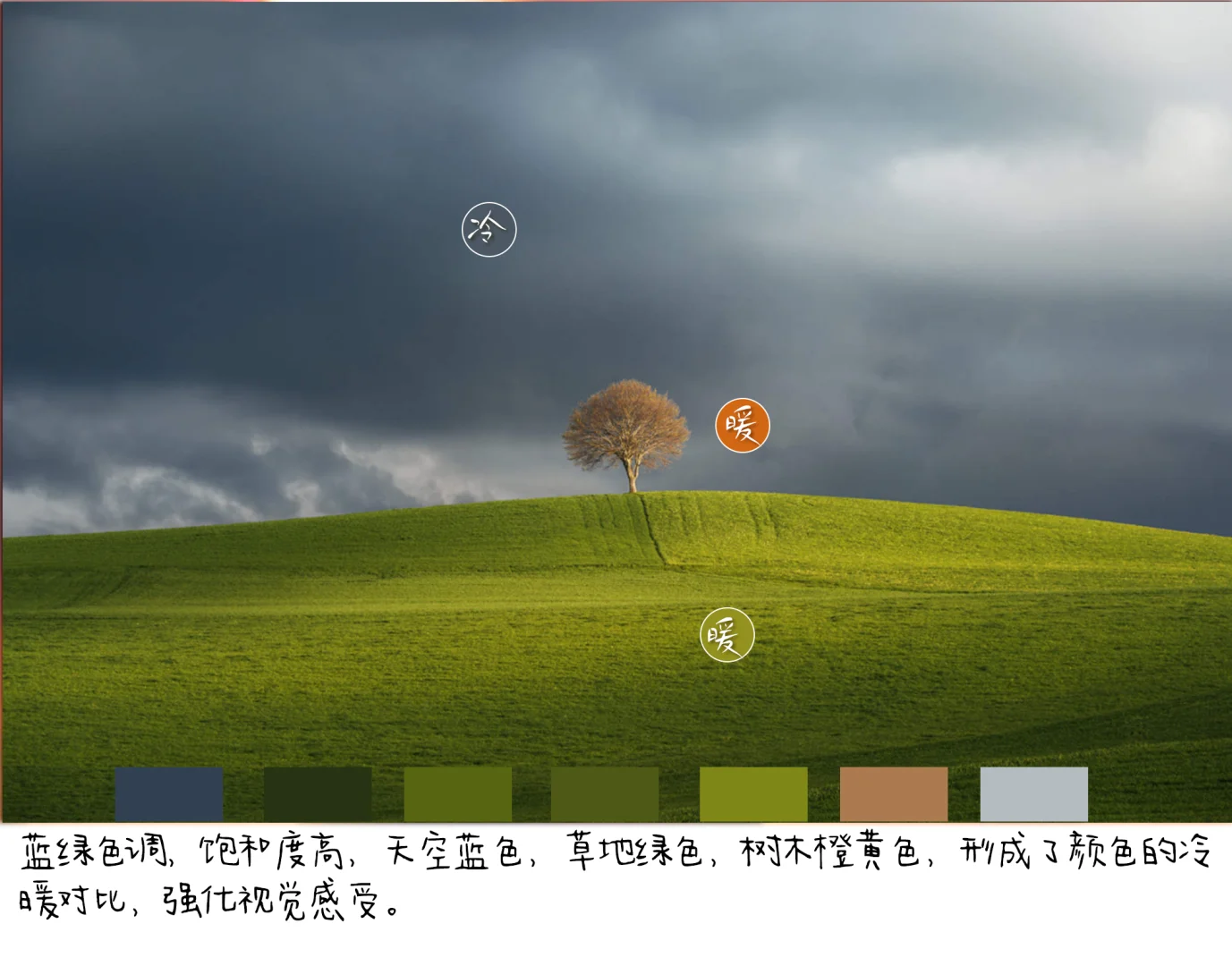 [四R].色彩:蓝绿色调,饱和度高,天空蓝色,草地绿色,树木橙黄色,形成了颜色的冷暖对比,强化视觉感受。