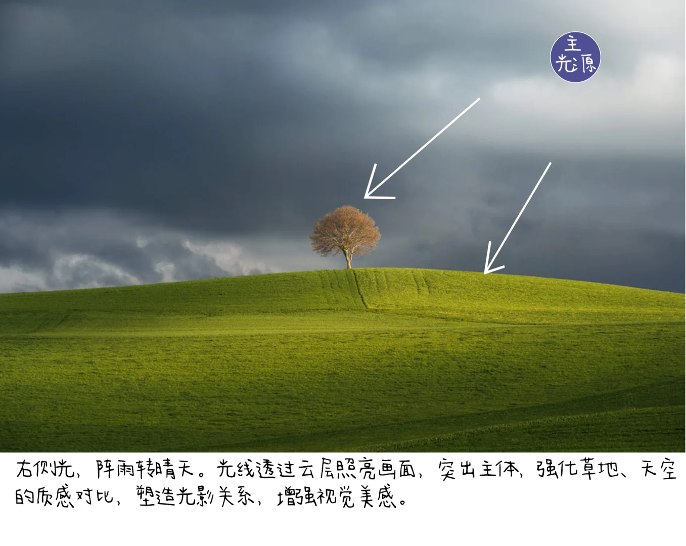 [二R].光线:右侧光,阵雨转晴天。光线透过云层照亮画面,突出主体,强化草地、天空的质感对比,塑造光影关系,增强视觉美感。