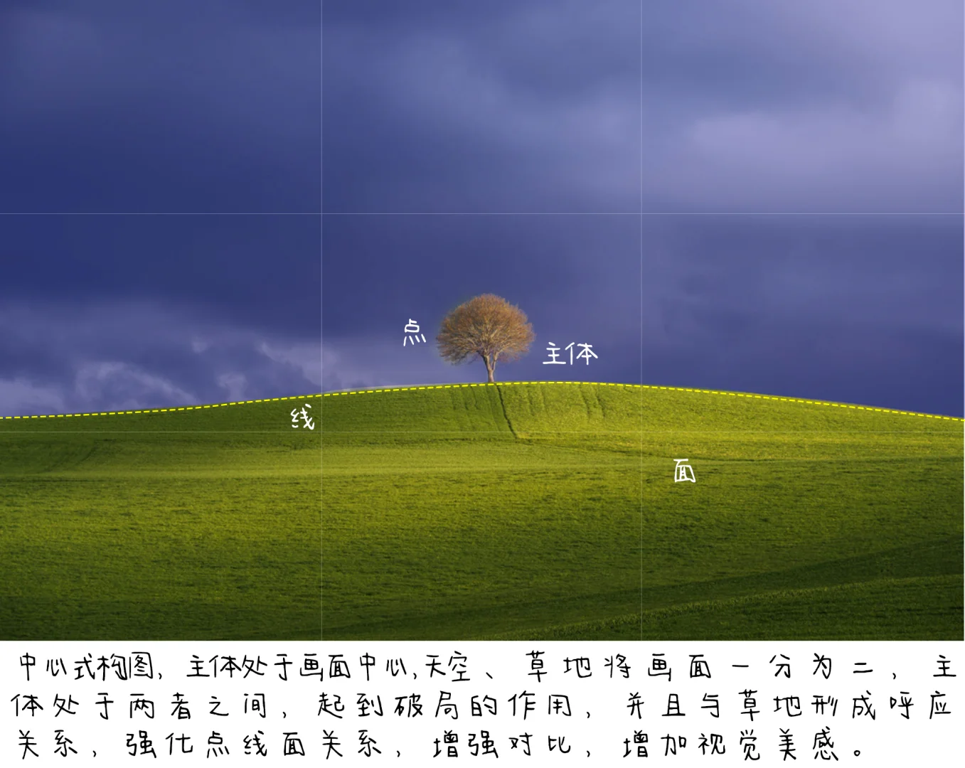 [一R].构图:中心式构图,主体处于画面中心,天空、草地将画面一分为二,主体处于两者之间,起到破局的作用,并且与草地形成呼应关系,强化点线面关系,增强对比,增加视觉美感。
