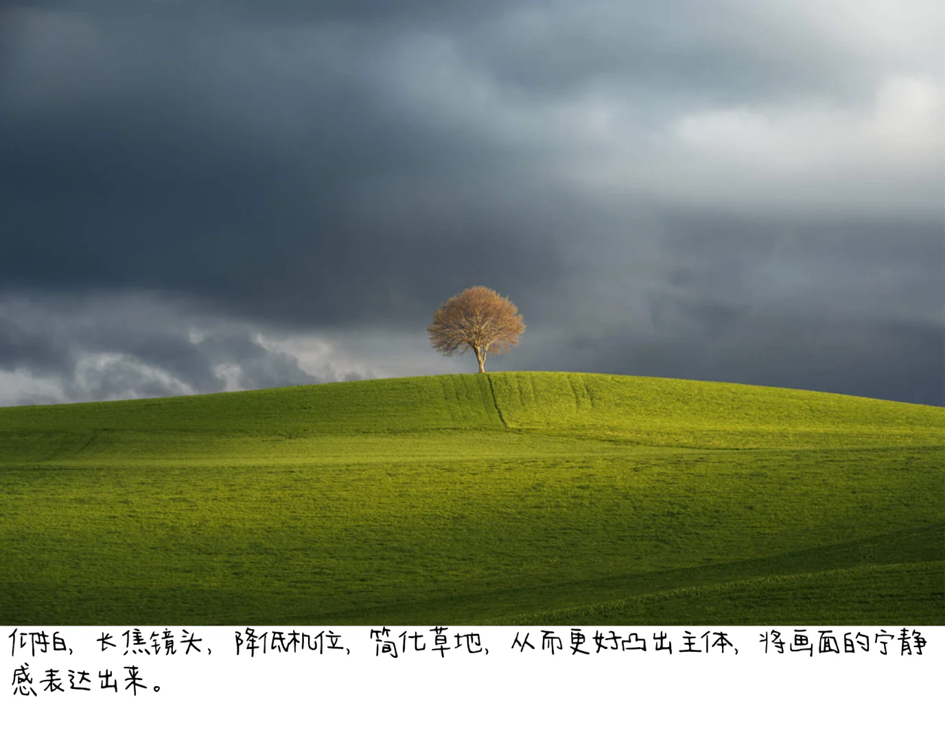 [五R].拍摄:仰拍,长焦镜头,降低机位,简化草地,从而更好凸出主体,将画面的宁静感表达出来。