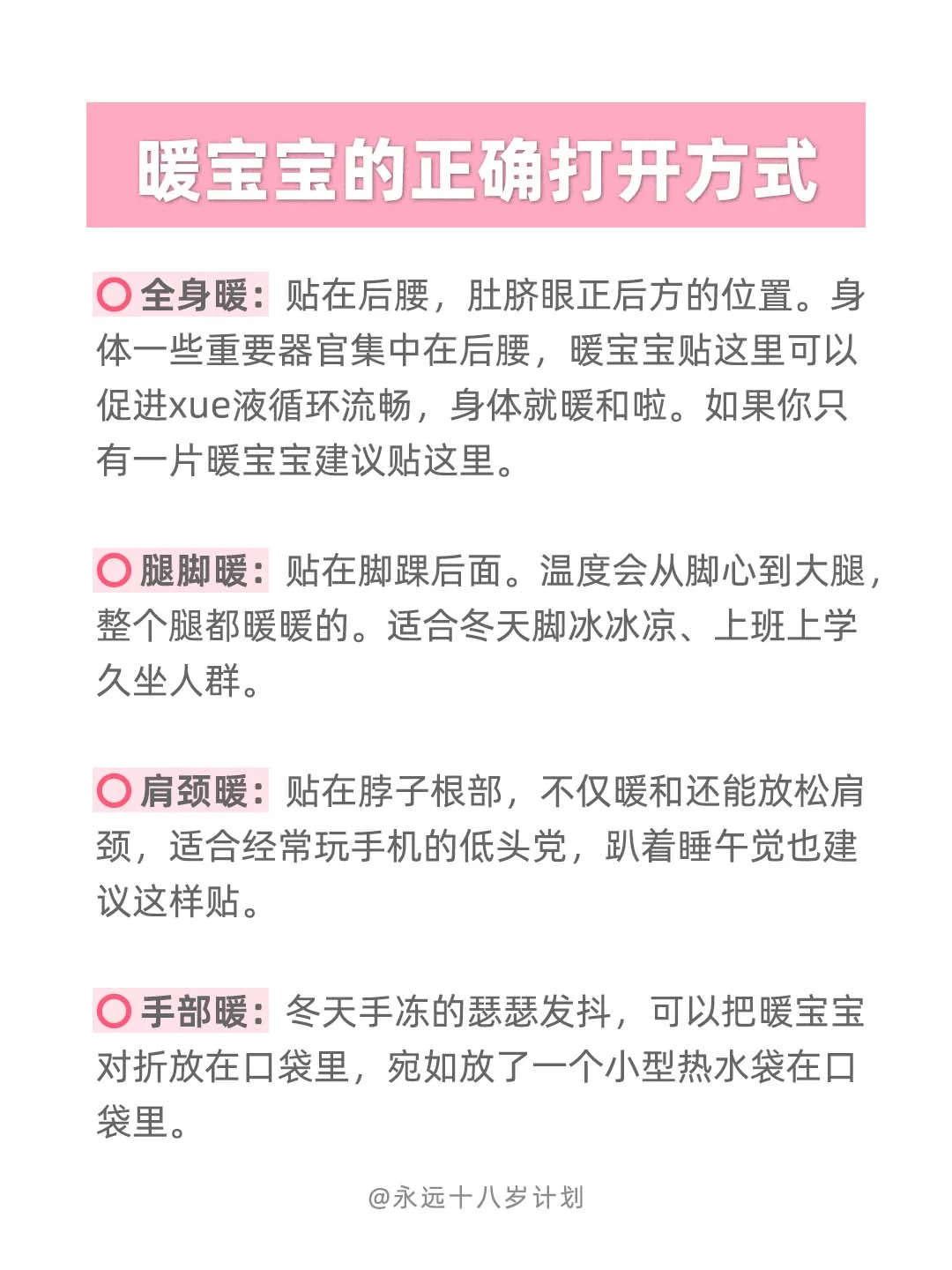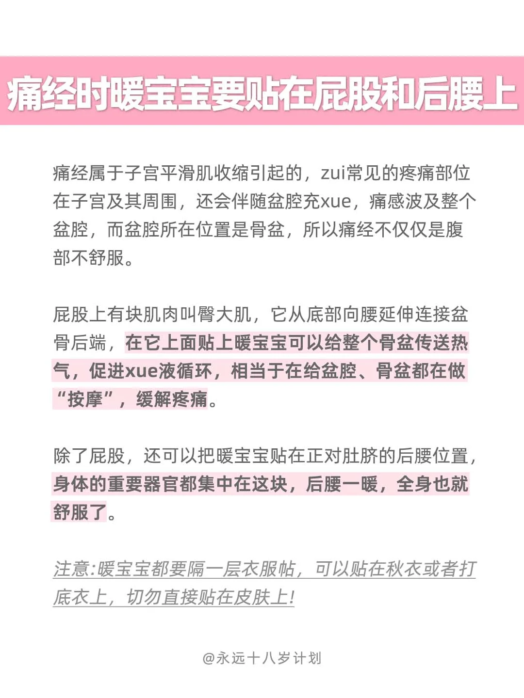 以前痛经的时候只把暖宝宝贴在腹部,效果微乎其微。换了贴法后,效果翻几倍!痛经严重的宝也可以屁股、后腰、腹部各贴一个~