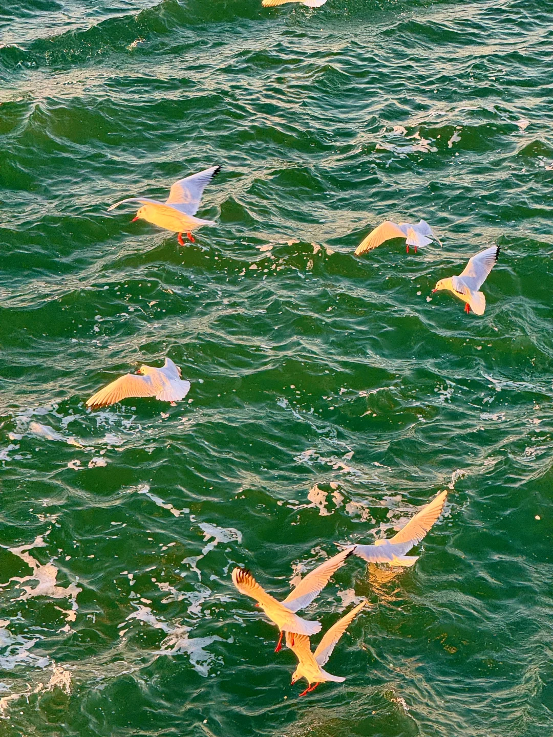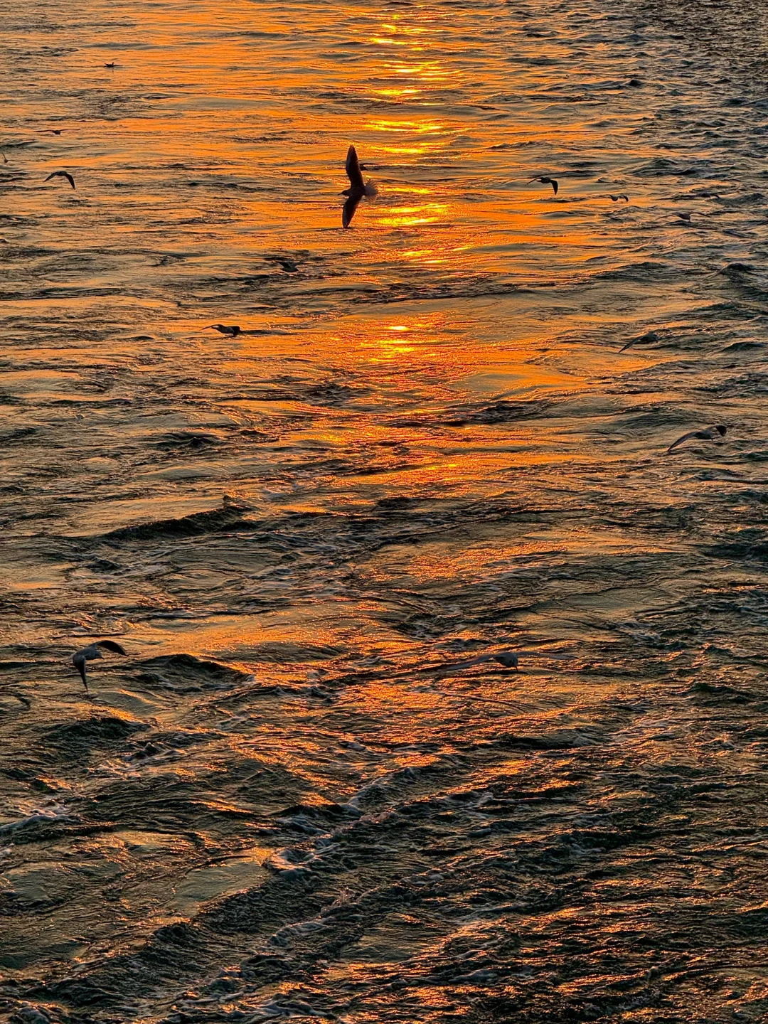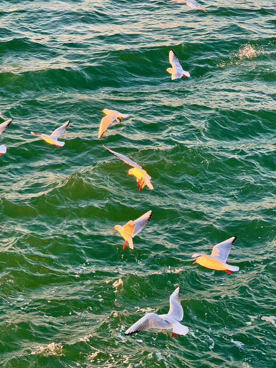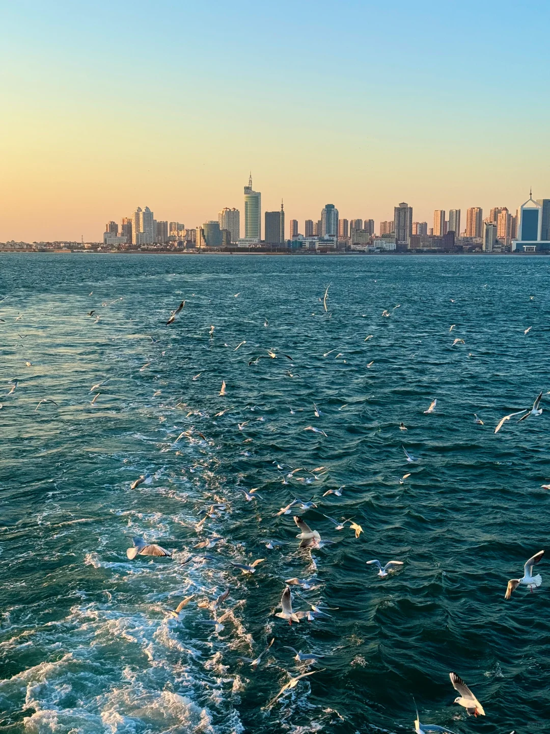 夕阳给海鸥镀了层金色的光✨青岛冬日之美