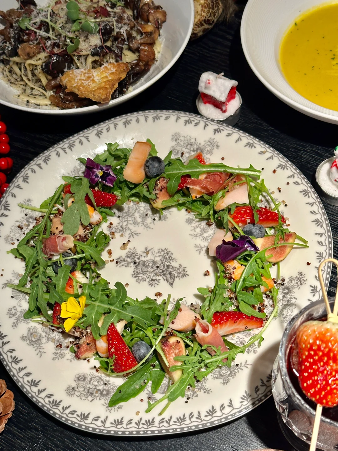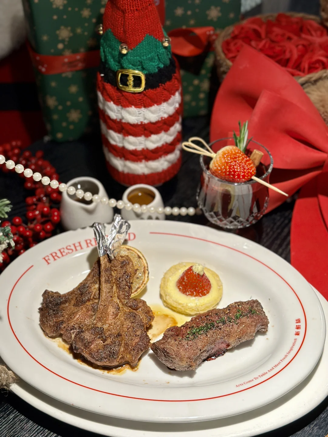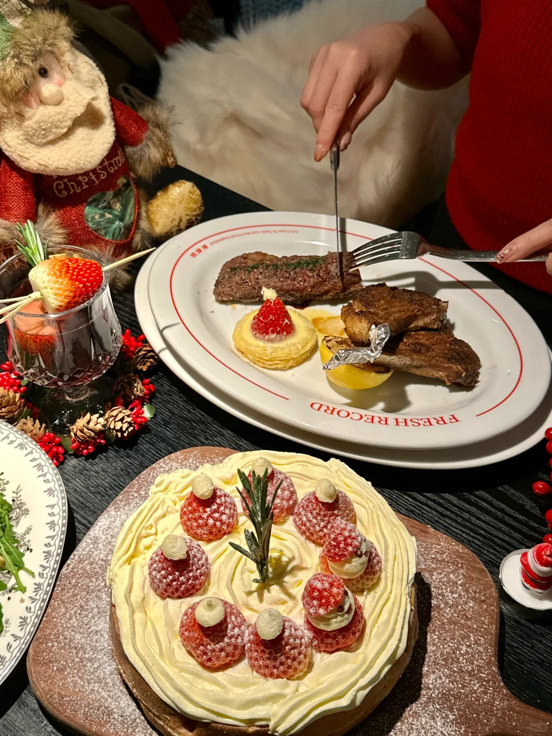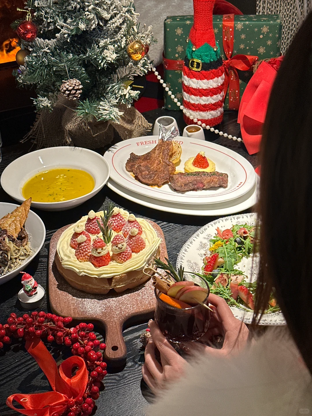 盛装的圣诞树,卡哇伊的圣诞爷爷.礼物、鲜花、气球、热红酒…围着壁炉吃敲漂酿滴圣诞大餐,在我这就是圣诞天花板!! 🎄圣诞雪花羊排、草莓蛋糕、圣诞沙拉、圣诞南瓜汤、每一个菜品造型都美翻~ 谁懂!还没开吃就拍了1000照片.. 而且还hin好吃!我还可以再来一万次!