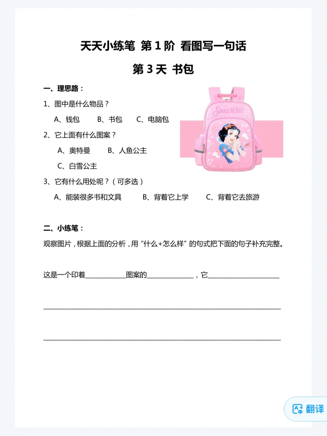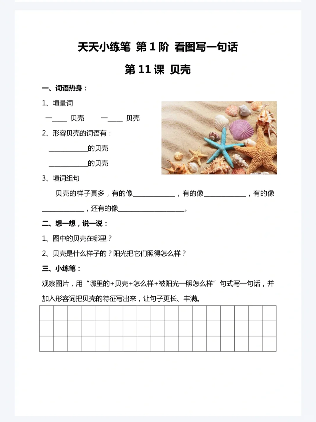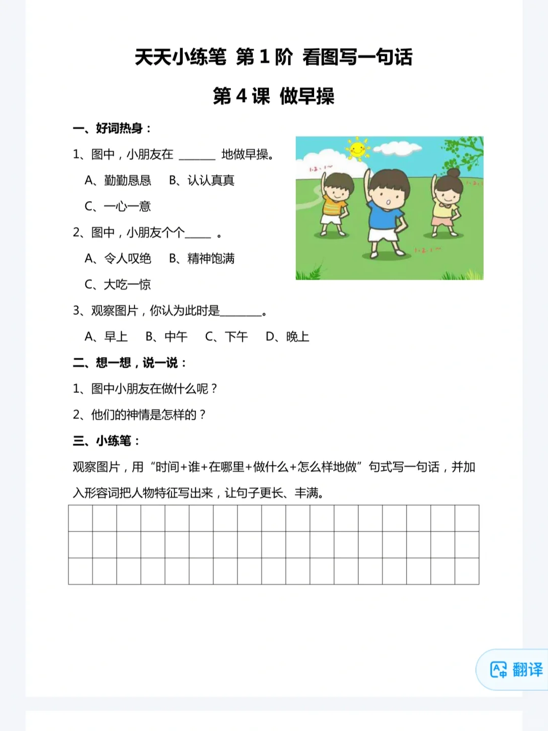 简短优秀的范文示例,为孩子提供直观的写作参照。这些范文用词简洁明了、语句通顺连贯,遵循一年级孩子的认知水平与语言表达习惯。孩子可以从中学到如何正确运用标点符号,怎样组织简单的句子结构,以及如何将观察到的内容有条理地转化为文字叙述。 大量的专项练习题目,让孩子在实践中巩固提升。从一句话的简单描述,到几句话的完整叙述,循序渐进地锻炼孩子的写作能力。每道题后还设有贴心的评价板块,方便家长或老师对孩子的作品进行及时反馈与指导,帮助孩子发现不足,不断进步。