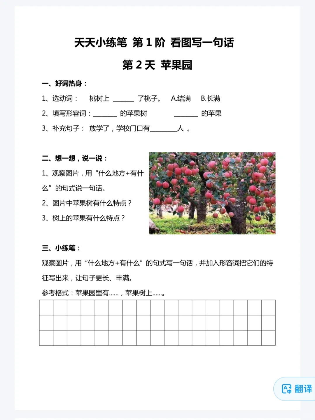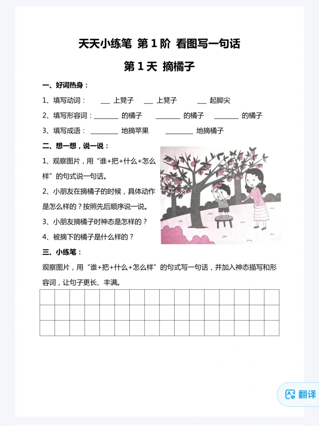 每篇看图写话均配备精准细致的引导提示。从观察图片的切入点,如人物的神态动作、景物的形状色彩,到思考故事的起因经过结果,逐步引导孩子理清写作思路。比如,在一幅描绘小朋友植树的图片旁,提示会引导孩子先观察小朋友们拿了哪些工具,他们的表情怎样,是怎样挖坑、种树、浇水的,通过一步步追问,让孩子脑海中的故事逐渐丰满。