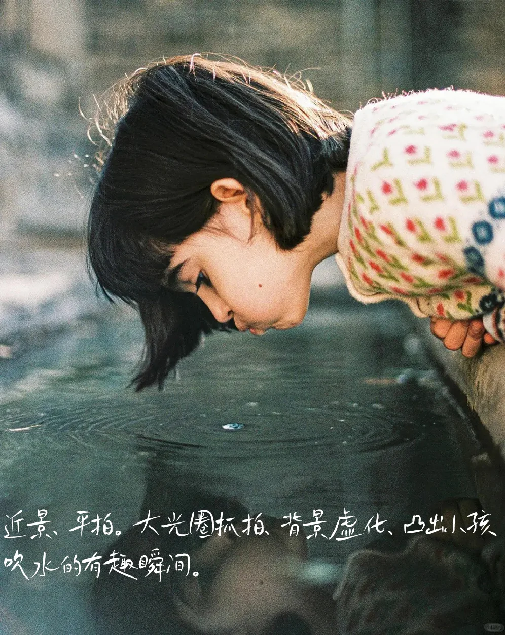 5拍摄:近景,平拍。大光圈抓拍,背景虚化,凸出小孩吹水的有趣瞬间。