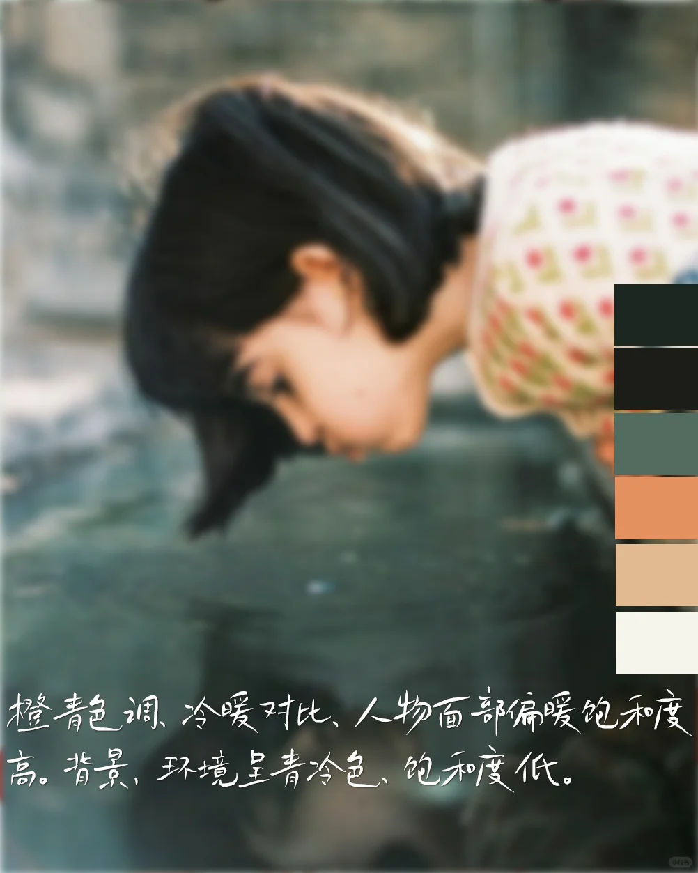 6.后期:画面颜色经过处理偏色,人物暖色,形成冷暖色对比。同时把人物面部提亮,压暗高光,把暗部提高,所以呈现出无死黑,曝光情况。