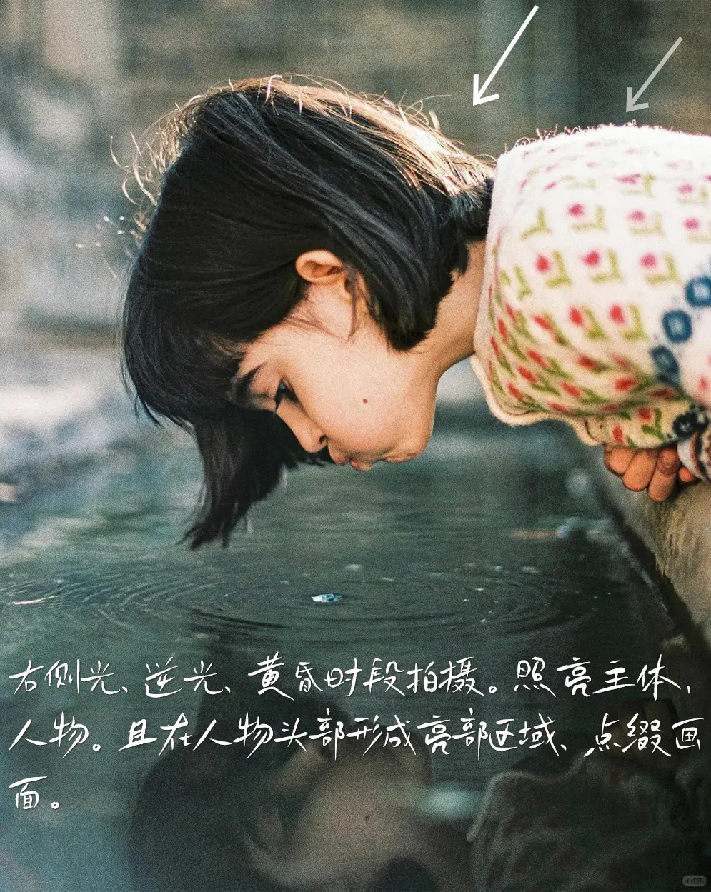 2光线右侧光,逆光,黄昏时段拍摄。照亮主体、人物。且在人物头部形成亮部区域,点缀画面。