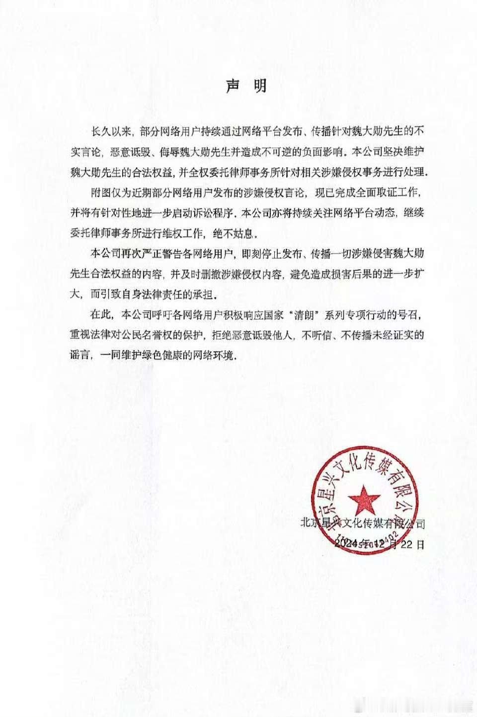 魏大勋工作室发布告黑声明 相信经过魏大勋工作室发布告黑声明之后,那些黑子们能够有所收敛,因为故意带节奏是真的有可能被抓进去啊!