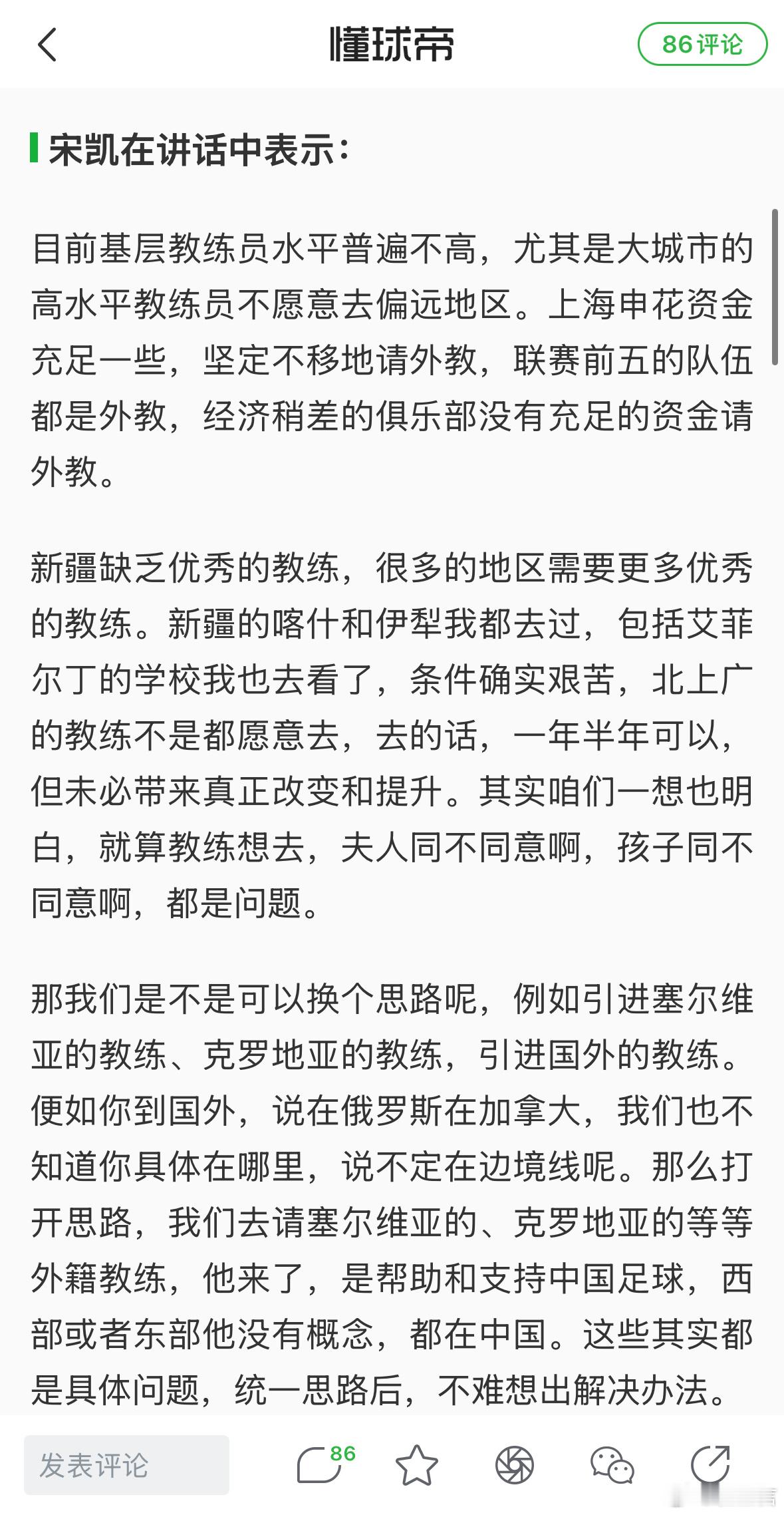 他说“那我们是不是可以换个思路呢,例如引进塞尔维亚的教练、克罗地亚的教练,引进国外的教练。便如你到国外,说在俄罗斯在加拿大,我们也不知道你具体在哪里,说不定在边境线呢。那么打开思路,我们去请塞尔维亚的、克罗地亚的等等外籍教练,他来了,是帮助和支持中国足球,西部或者东部他没有概念,都在中国。这些其实都是具体问题,统一思路后,不难想出解决办法。”