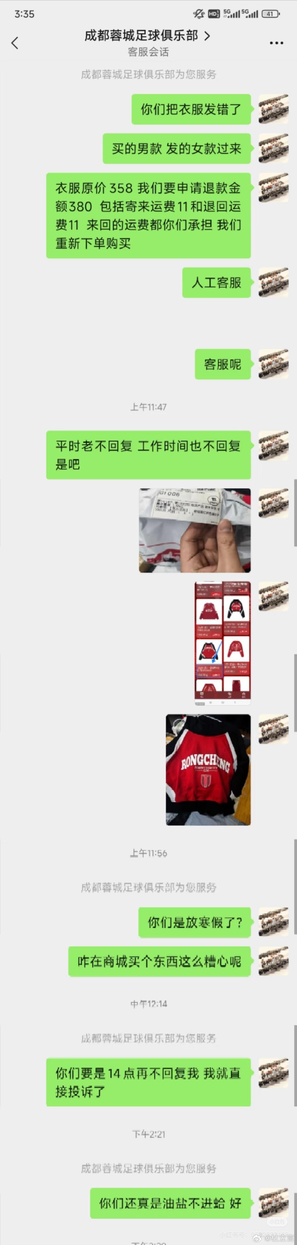 有球迷在成都蓉城俱乐部商城购买了一件卫衣,结果俱乐部错发成了女款。这位球迷联系售后退换,电话无人接听,消息无人回应。