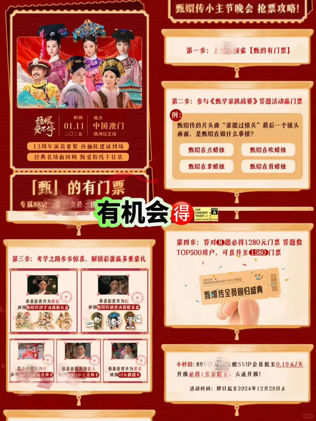 🤪那年杏花微雨,你说你是果子狸 🎵本甄学十级爱好者的人生BGM 💕又爱又恨的角色,每一天都在重映 🌟13年,甄嬛大戏重聚,不再是AI做的“饭” 🎬还有机会亲临现场见证戏里戏外的“相爱相杀” 📌上“酷”🔍“甄的有门票”即可参与答题活动,答对8题🉑️得1280💰《甄嬛传》小主节晚会门票,更多操作戳末图,一键解锁~