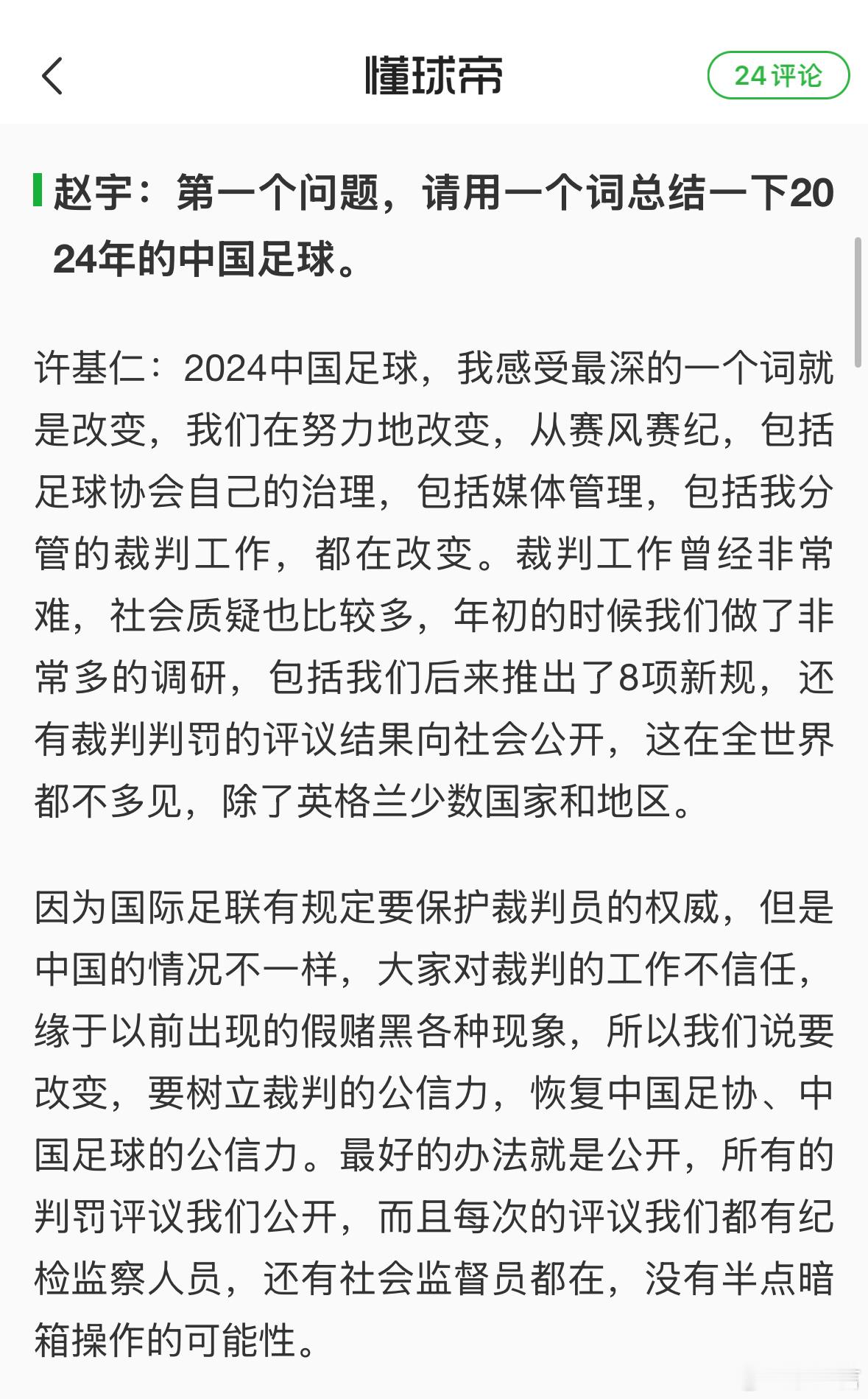足协副主席许基仁表示“2024中国足球,我感受最深的一个词就是改变,我们在努力地改变,从赛风赛纪,包括足球协会自己的治理,包括媒体管理,包括我分管的裁判工作,都在改变。”