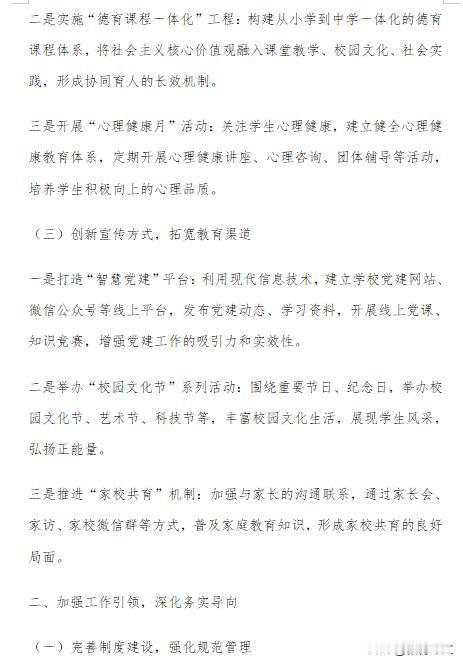 2025年学校党建工作计划怎么写?6个引领6个导向谋划教育新篇 6个引领6个导向做好2025年学校党建工作计划,写得太好! 点击右上角关注我,遇见更多教育好文章好材料。 本文字数4543字,阅读需要7分钟,发言需要25分钟 【这份由教育好文构思撰写的党建工作计划紧密围绕学校党建工作的核心要求,结合学校实际,提出了具体可行的工作措施和目标,旨在通过全面加强党的建设,推动学校各项工作高质量发展,文风保持了教育好文一贯的风格,尤其是小标题逻辑清晰。相信这份计划能够得到学校管理同仁的认可与赞赏,共同为学校的美好未来贡献力量!】开篇 在新时代的征程上,学校作为立德树人的主阵地,党建工作不仅是灵魂工程,更是推动教育教学高质量发展的强大引擎。2025年,我们将以重要会议精神【自行修改为准确表达,学校书记懂的都懂】为指引,深入贯彻党的教育方针,坚持和加强党对学校工作的全面领导,通过“6个引领6个导向”,全面加强学校党的建设,引领学校各项工作再上新台阶,为培养德智体美劳全面发展的社会主义建设者和接班人提供坚强的政治保证和组织保障。 下面,从6个方面制定2025学校党建工作计划: