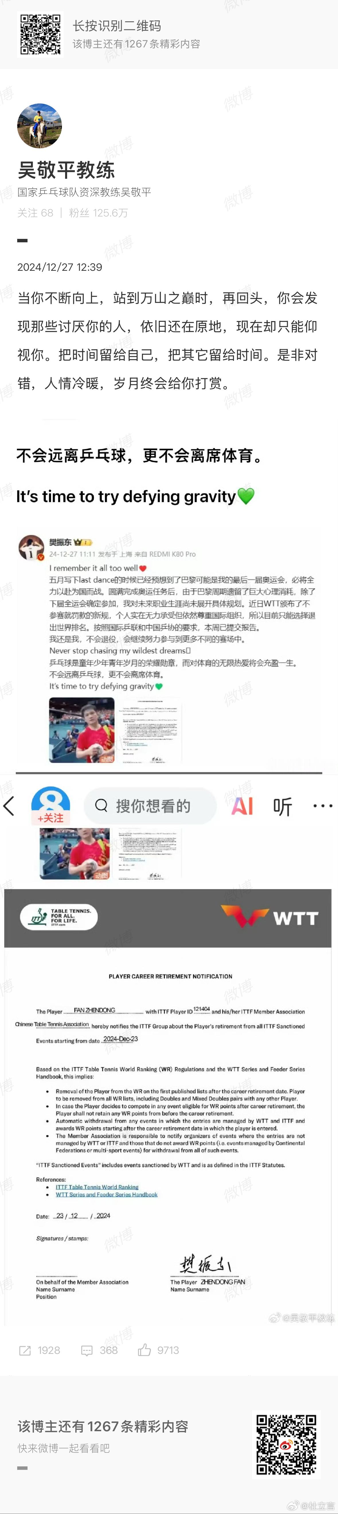樊振东的恩师吴敬平教练写道“当你不断向上,站到万山之巅时,再回头,你会发现那些讨厌你的人,依旧还在原地,现在却只能仰视你。把时间留给自己,把其它留给时间。是非对错,人情冷暖,岁月终会给你打赏。”