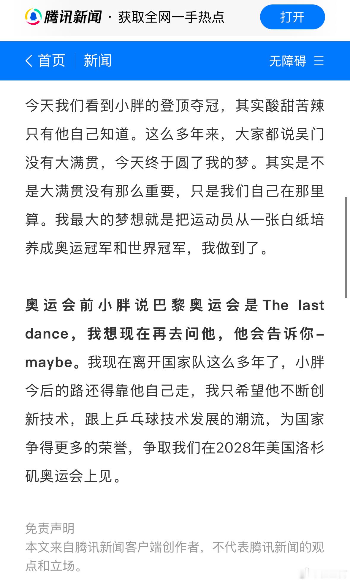 樊振东奥运男单夺冠后,他这样说道“奥运会前小胖说巴黎奥运会是The last dance,我想现在再去问他,他会告诉你-maybe。我现在离开国家队这么多年了,小胖今后的路还得靠他自己走,我只希望他不断创新技术,跟上乒乓球技术发展的潮流,为国家争得更多的荣誉,争取我们在2028年美国洛杉矶奥运会上见。”