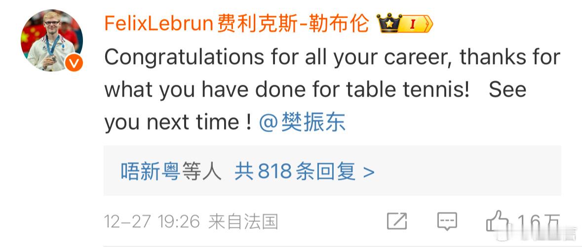 奥恰洛夫对樊振东的决定表示意外。其实,现役外协选手对此并不会感到太意外。你看F勒布伦,就直接送上了祝贺。