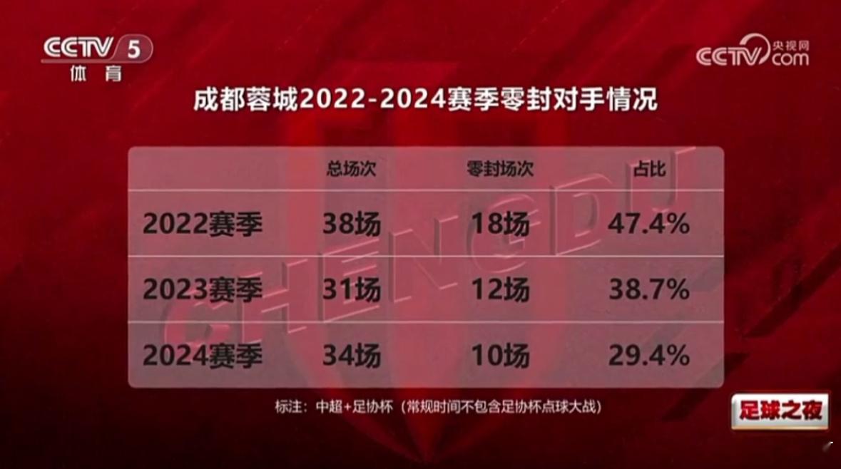 《足球之夜》成都蓉城特别节目。从这两组数据可以看出,虽然近三个赛季的联赛丢球数(28-32-31)接近,但该队的零封场次和占比均在下降,本赛季对阵TOP5球队的战绩也是三年来的新低。