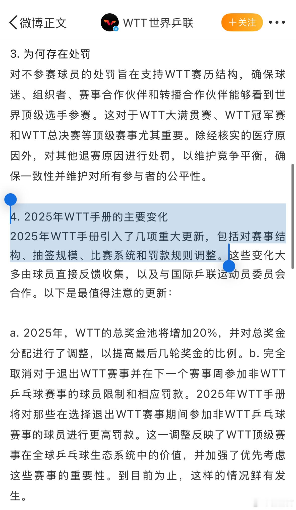2025年WTT手册引入了几项重大更新,包括对赛事结构、抽签规模、比赛系统和罚款规则调整。