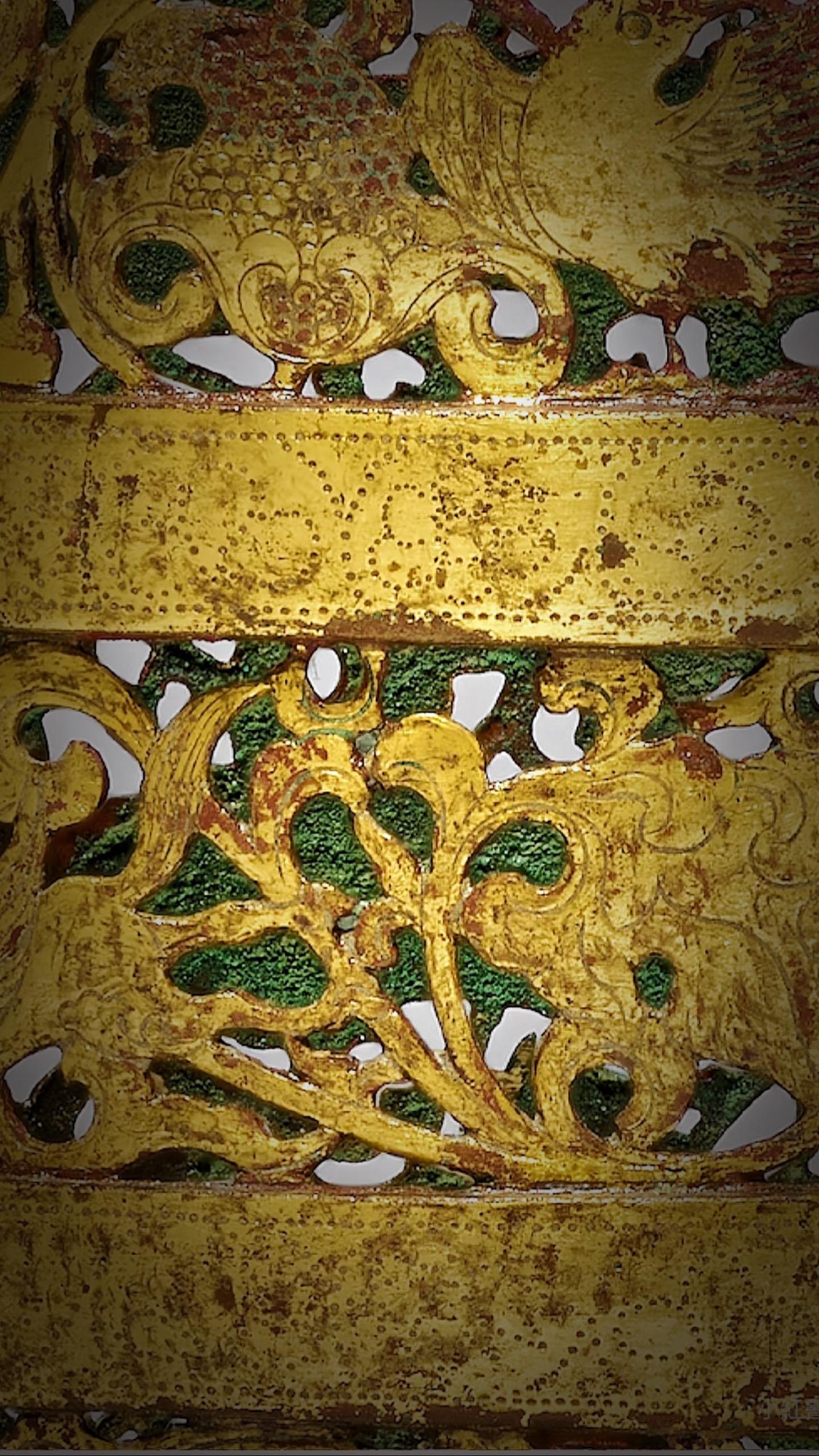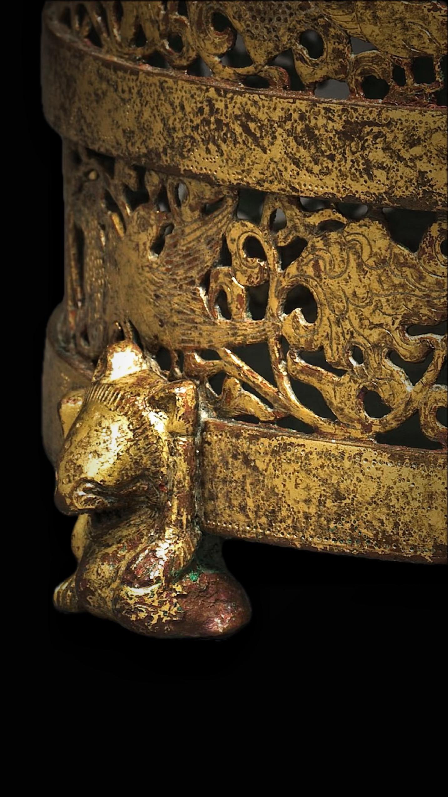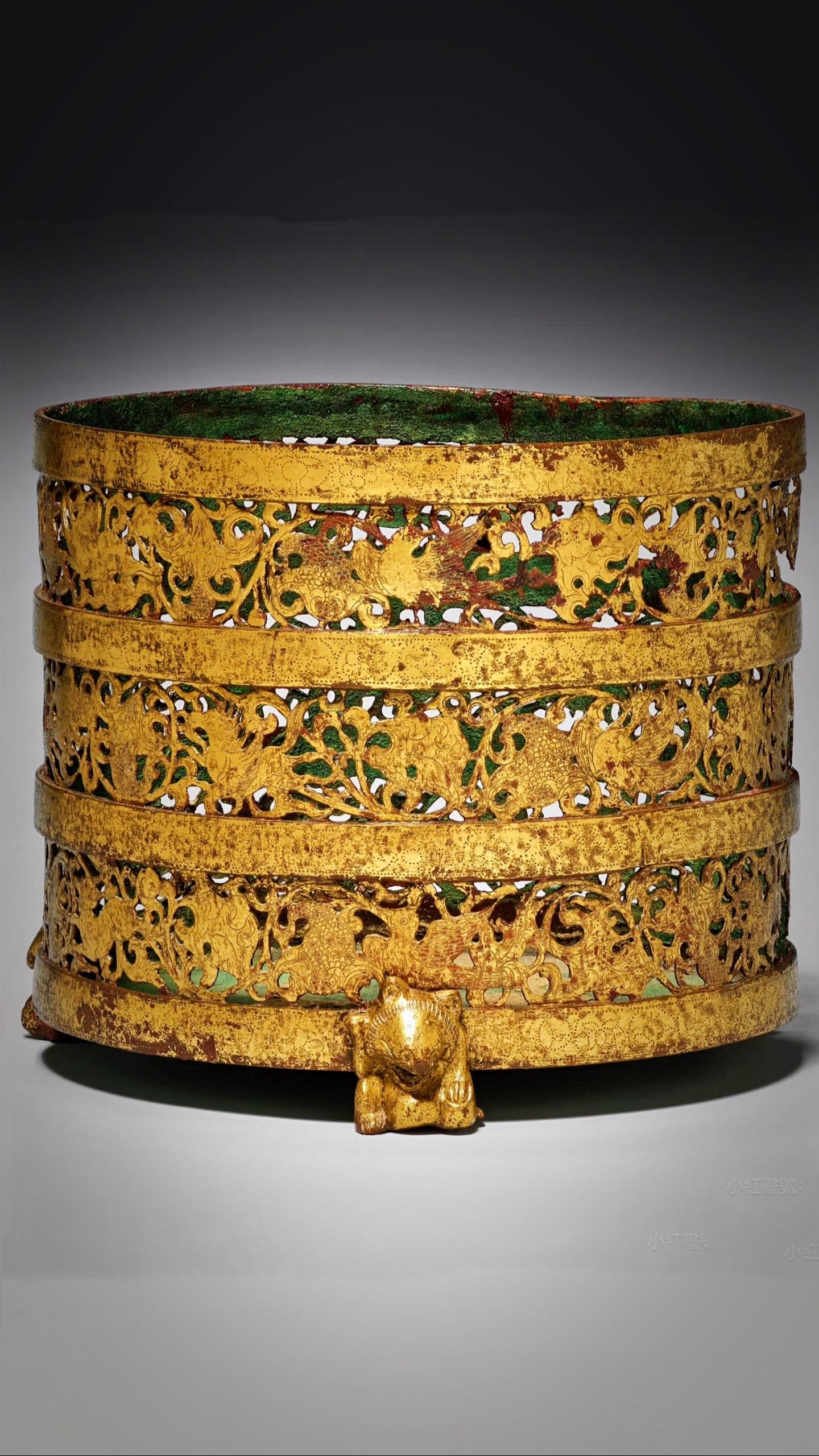 此奁圓筒形器身、深直壁、平底、三獸足,器外壁飾帶紋,全器鎏金,现藏于美国克利夫兰博物馆