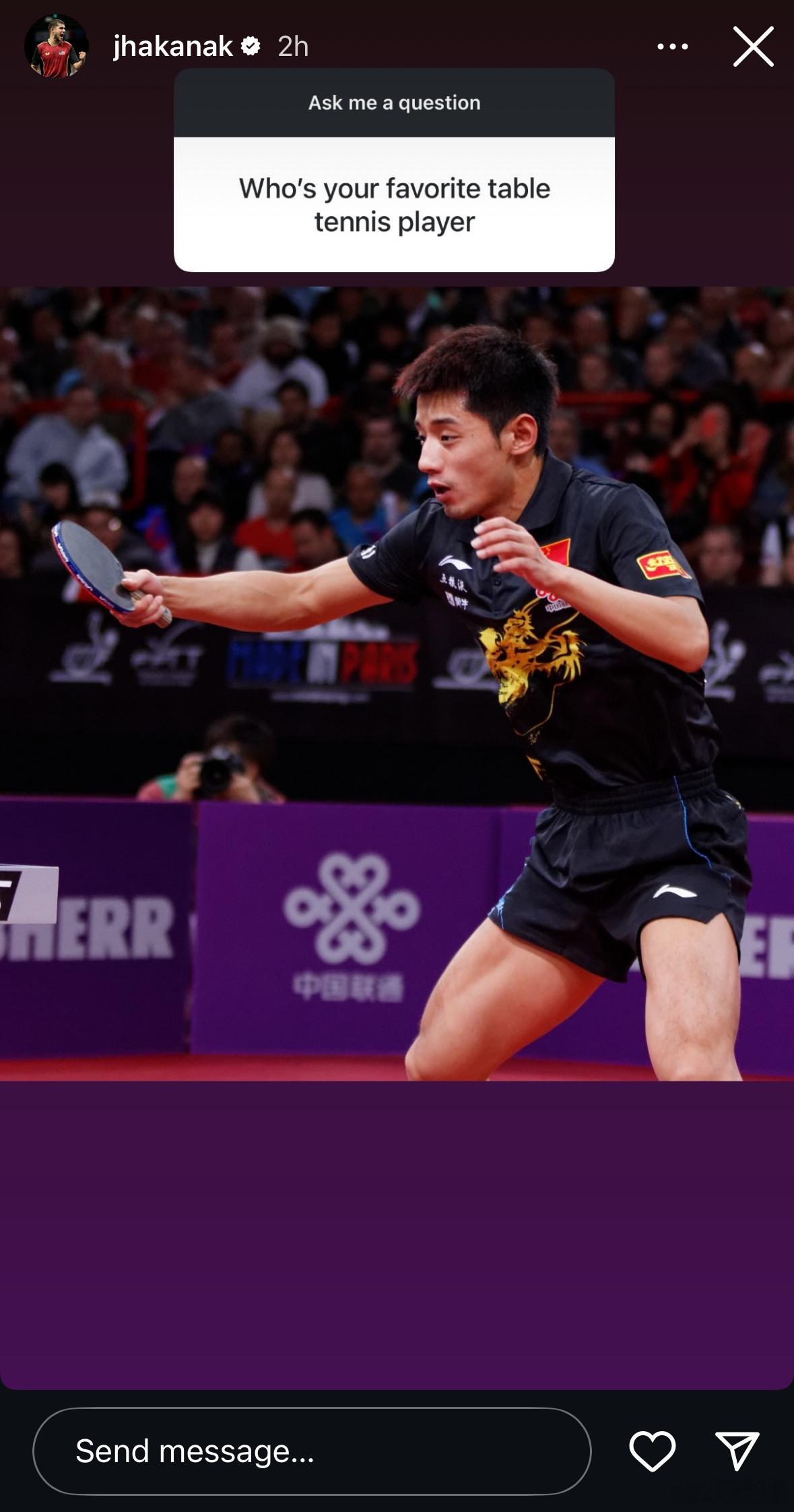 同时,卡纳克·贾哈称自己最喜爱的乒乓球运动员是张继科。