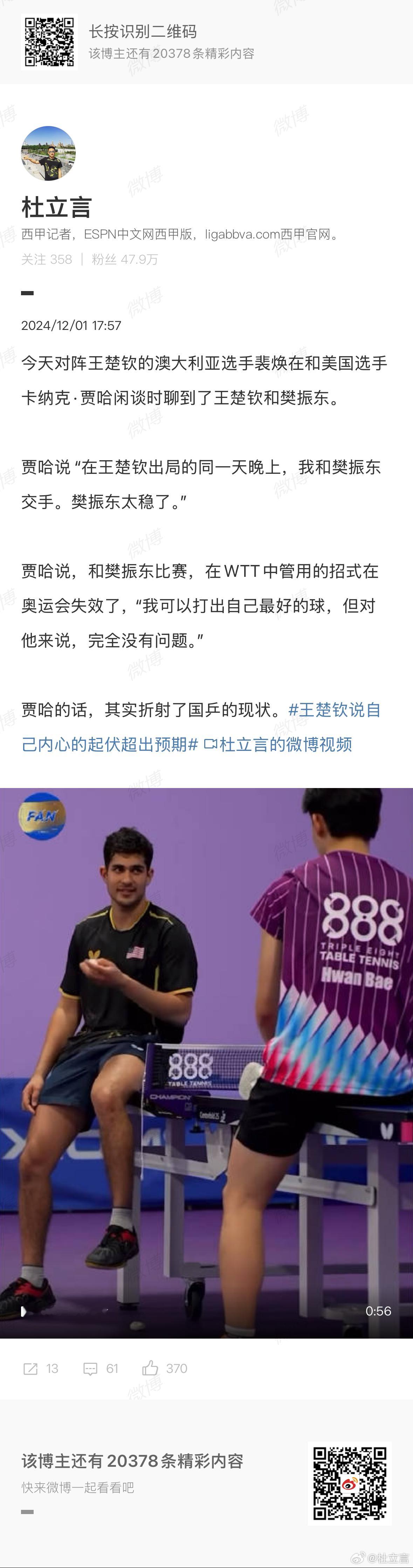 此前回顾巴黎奥运会时,卡纳克·贾哈说,和樊振东比赛,在WTT中管用的招式在奥运会失效了,“我可以打出自己最好的球,但对他来说,完全没有问题。”