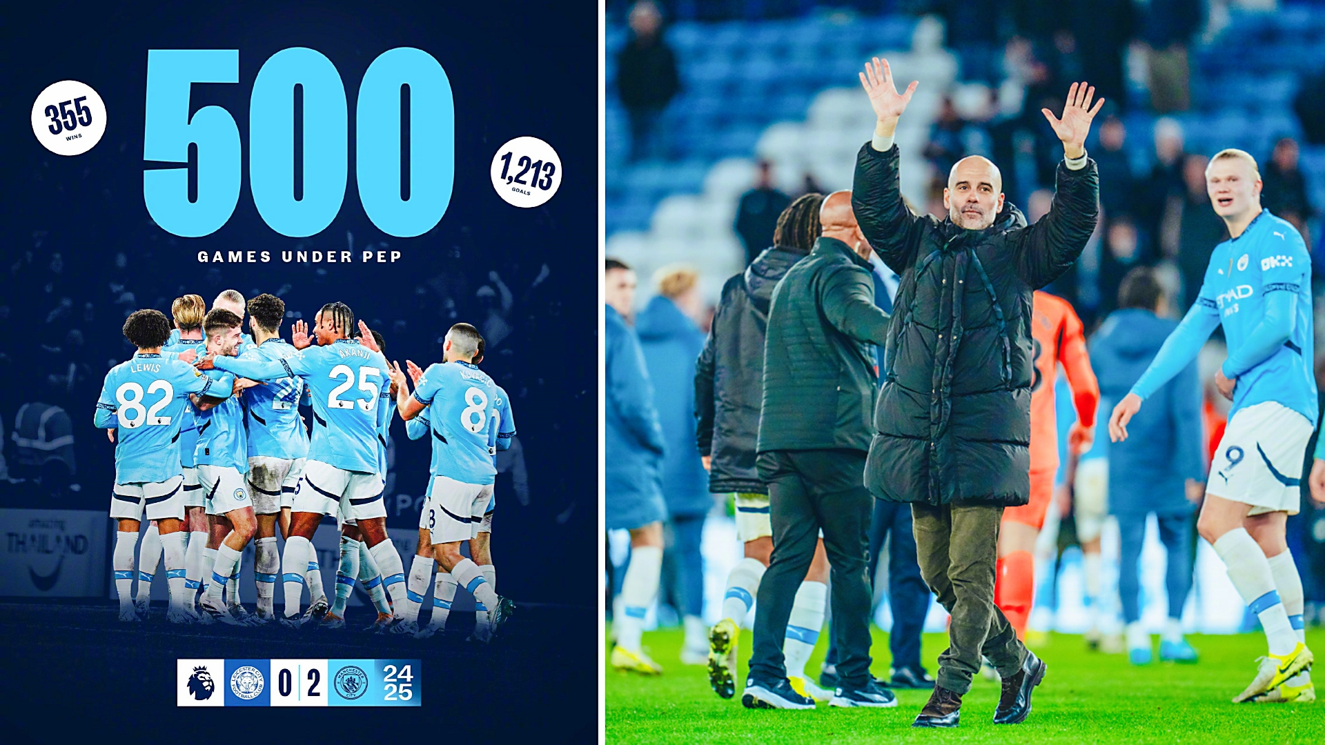 英超:曼城客场2-0击败莱斯特城,瓜帅曼城500场里程碑获胜。 萨维尼奥传射建功,哈兰德破4场球荒,蓝狐遭遇4连败。