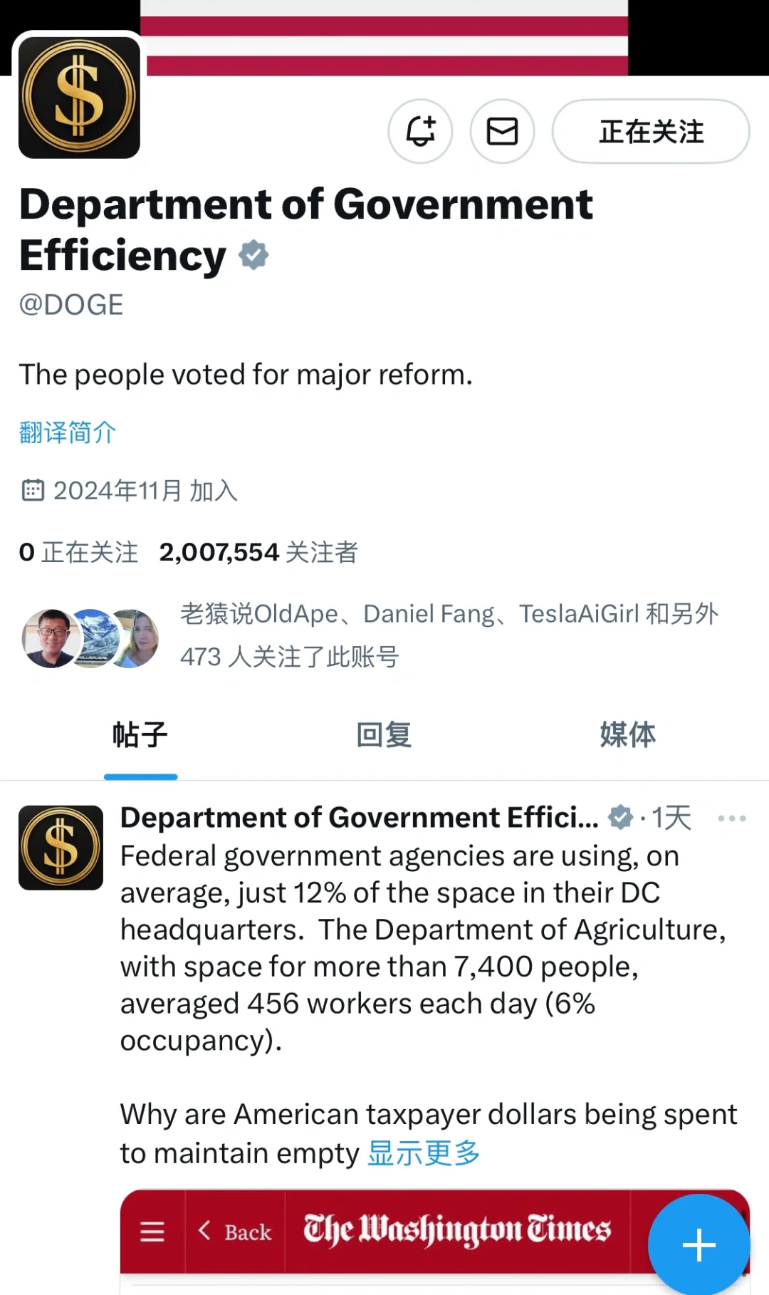 马斯克和维维克的政府效率部在𝕏上的账号关注者刚刚达到200万。