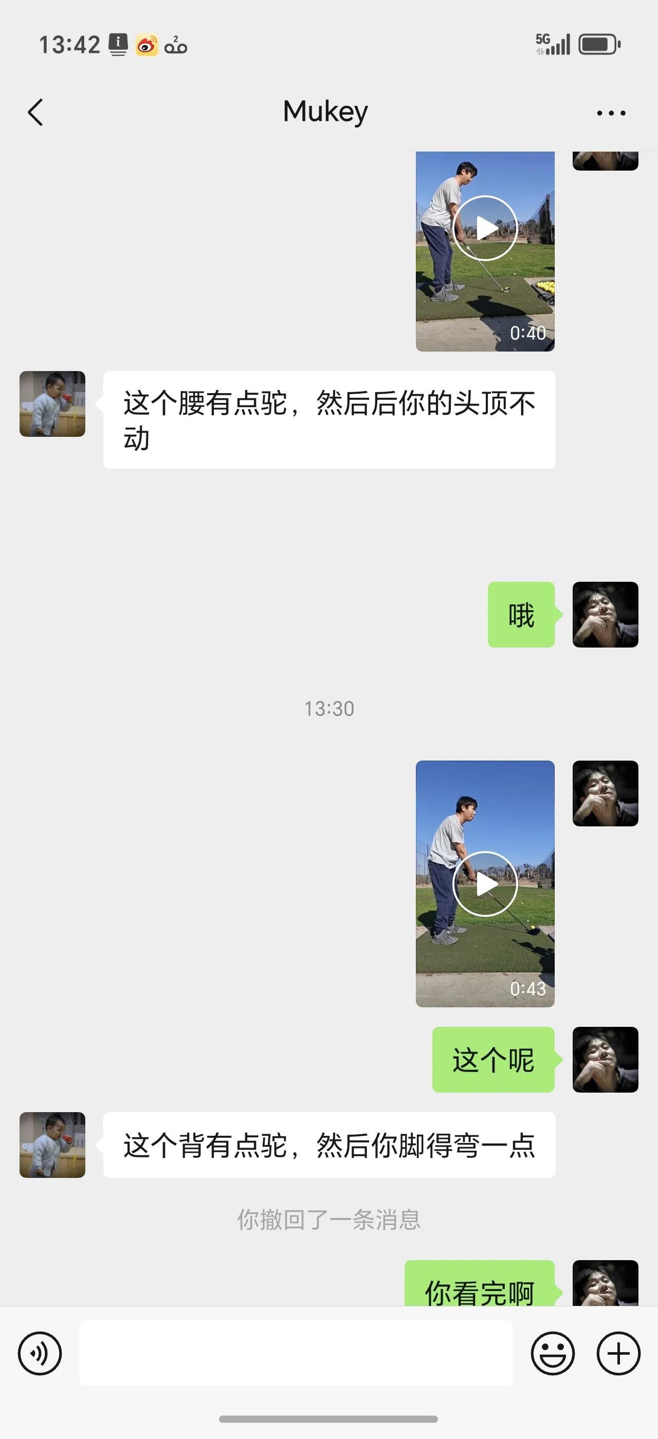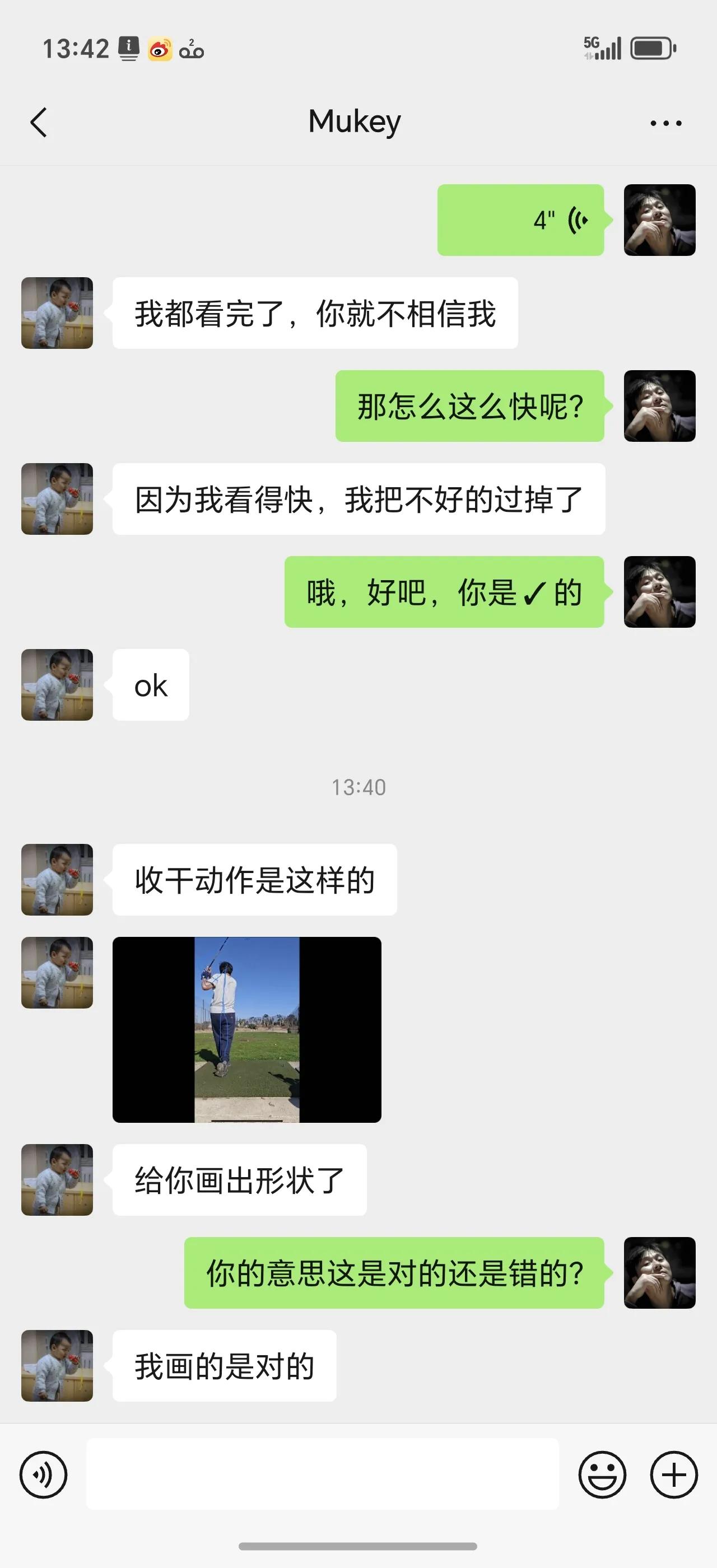 儿子教我打高尔夫,你觉得他说得对么?我怎么有点半信半疑。 早上我去练高尔夫,让儿子给我一点指导。他在打游戏,不想去。但是看到我期待的眼睛,为了安慰我,他说:等下你在练习场拍视频发我,我会在线指导。 于是有了下面截图,你们觉得他说得对么?