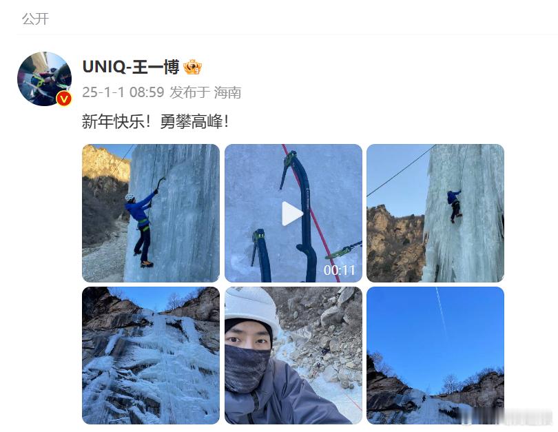王一博新年第一天发攀冰照 王一博祝大家勇攀高峰 哈哈,王一博新年第一天就来秀攀冰照啦,这是在告诉我们他的新年打开方式有多酷炫吗?还祝大家勇攀高峰,得嘞,一博都发话了,咱 2025 年就甩开膀子往高峰上爬吧,哈哈。