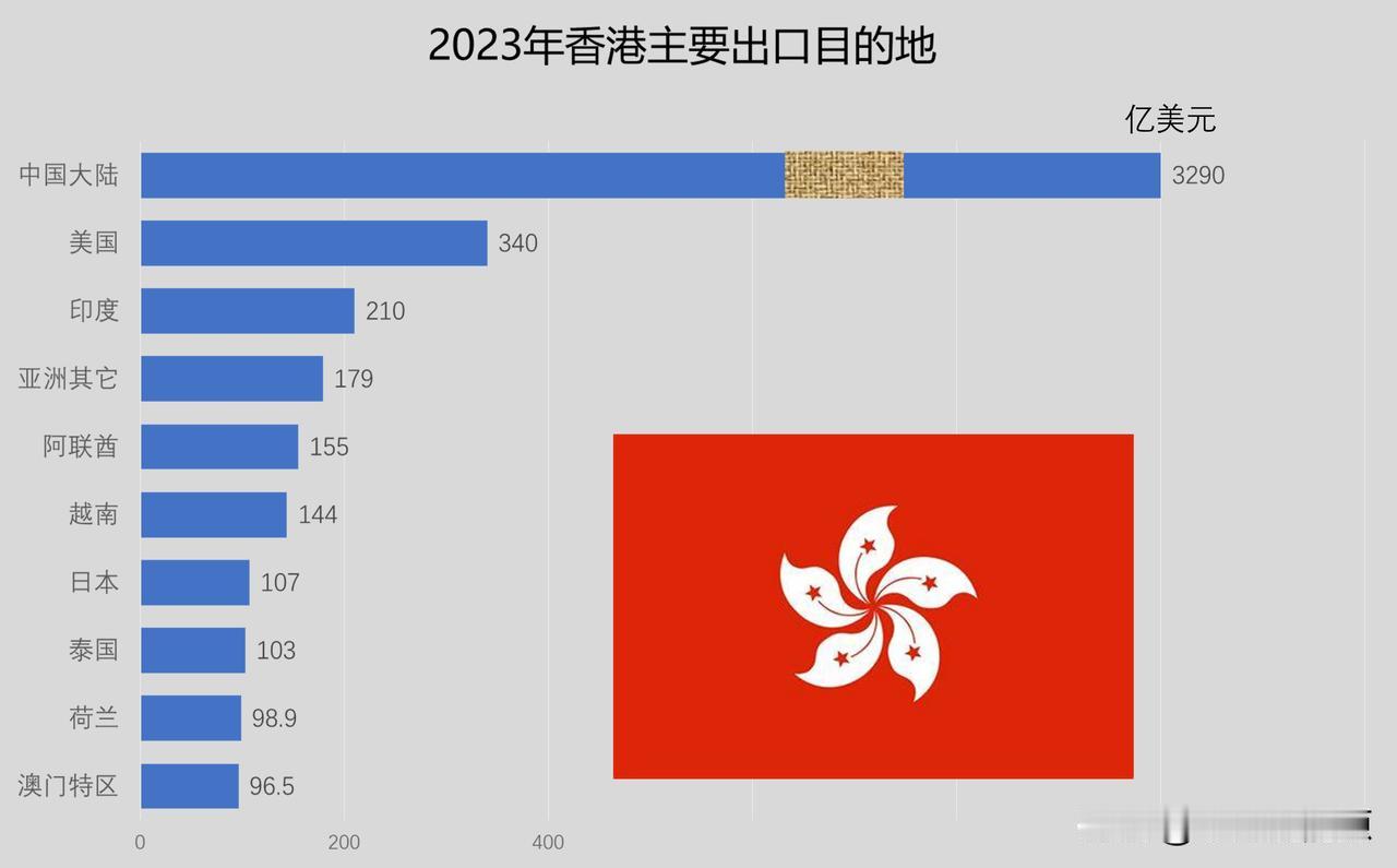 2023年香港商品的主要出口目的地是哪里?主要出口哪些类型的商品? 2023年,香港的商品出口总值达5750亿元。香港商品出口总值较2022年下降5.75%,商品出口额减少350亿元(2022年香港的商品出口总值达6,100亿元)。 01 2023年香港商品出口的主要目的地: ——中国大陆占57%(3290亿美元) ——美国占6.05%(340亿美元) ——印度占3.77%(210亿美元) ——亚洲其他国家,占3.12%(179亿美元) ——阿拉伯联合酋长国,份额2.7%(155亿美元) ——越南占2.5%(144亿美元) ——日本占1.87%(107亿美元) ——泰国占1.79%(103亿美元) ——荷兰占1.72%(98.9亿美元) ——中国澳门特区占1.67%(96.5亿美元) 02 2023年香港的出口结构,以下列主要商品类别为代表: ——58%(3350亿美元):85 -电气机械和设备及其零配件;录音、复制器、电视影像、录音、复制器及其零配件 ——14.1%(810亿美元):71 -天然或养殖珍珠、宝石或半宝石、贵金属、镶有贵金属的金属及其制品;人造珠宝; 硬币 ——12.6%(720亿美元):84-核反应堆、锅炉、机械和机械设备及其零配件 ——2.51%(144亿美元):90 -光学、摄影、电影、测量、检查、精密、医疗或外科仪器和设备及零配件 ——1.21%(69.6亿美元):91 -钟表及其零配件 ——1.19%(68.5亿美元):97件艺术品、收藏品和古董 ——0.787%(45.3亿美元):39 -塑料及其制品 ——0.761%(43.8亿美元):33 -精油和树脂;香水、化妆品或盥洗用品 ——0.548%(31.5亿美元):61-针织或钩编成衣及成衣配饰 ——0.532%(30.6亿美元):62 -非针织或钩编的服装和服装配饰
