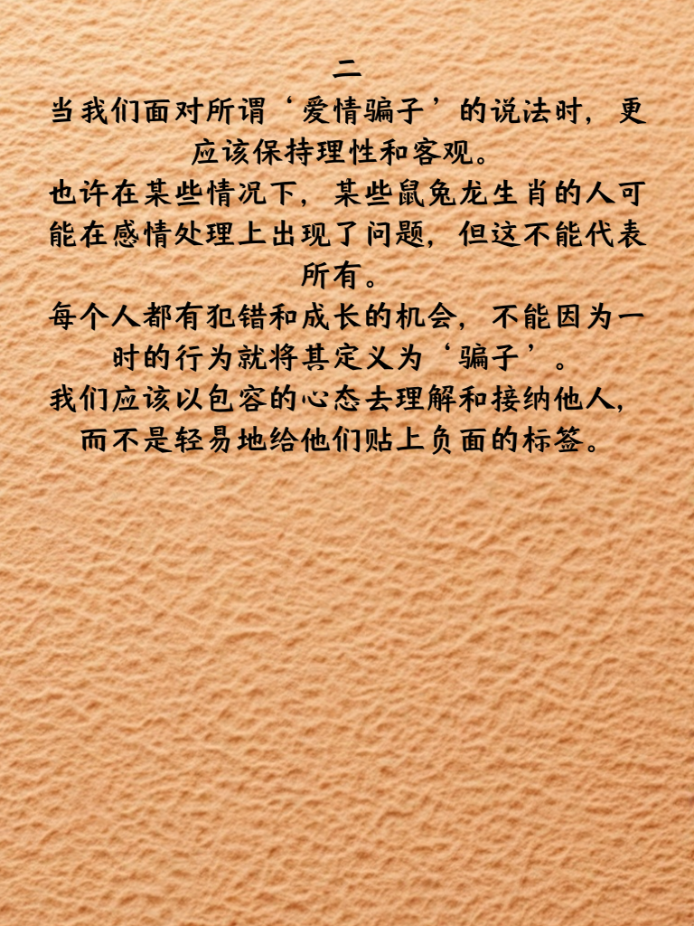 一、在情感的舞台上,常常会有一些关于生肖与爱情的传闻。就如这鼠兔龙,被传言在情场中最为贪婪。然而,我们不能仅凭生肖就轻易给一个人贴上这样的标签。每个生肖都有其独特的性格特点,但这并不意味着整个生肖群体都具有某种共性。爱情是复杂而多元的,不能用简单的生肖划分来评判一个人的爱情态度。 二、当我们面对所谓‘爱情骗子’的说法时,更应该保持理性和客观。也许在某些情况下,某些鼠兔龙生肖的人可能在感情处理上出现了问题,但这不能代表所有。每个人都有犯错和成长的机会,不能因为一时的行为就将其定义为‘骗子’。我们应该以包容的心态去理解和接纳他人,而不是轻易地给他们贴上负面的标签。 三、在爱情的世界里,真正重要的是彼此的真诚和理解。无论属于哪个生肖,只要双方都能用心去经营感情,尊重对方,相互信任,那么就有可能拥有一段美好的爱情。不要被那些不实的传闻所影响,用自己的眼睛去观察,用自己的心灵去感受,才能找到真正属于自己的幸福。