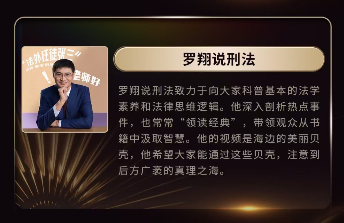 罗翔已连续五年获百大UP主 谁看了不说一句罗翔老师牛逼!!👏罗翔老师做UP主五年收获三千万粉丝,每条视频质量都超高,跟着罗翔老师学了好多法律知识!除此之外,罗翔老师的很多发言,在我很多词不达意的困惑时刻是嘴替、是稳重又风趣的知识来源定心丸,也是我多少顿饭的下饭神器!呜呜恭喜!!很高兴我是三千万粉丝之一嘿嘿!!!不仅如此,所有百大UP也都是优秀的横屏内容创作者!!即使在更高的设备要求与制作成本的投入下,依然打造着一个个精品视频!!百大UP主们都实至名归!!