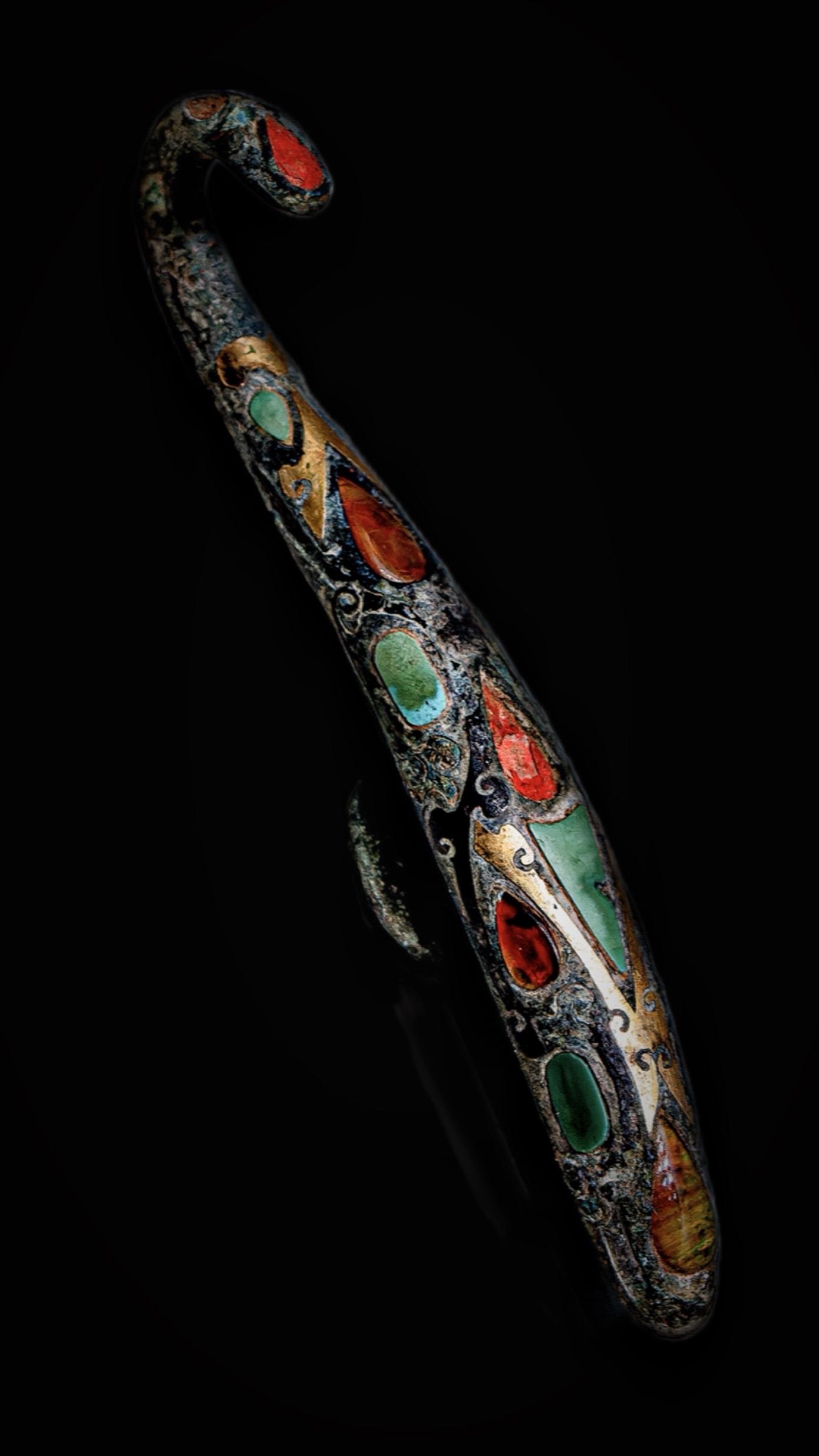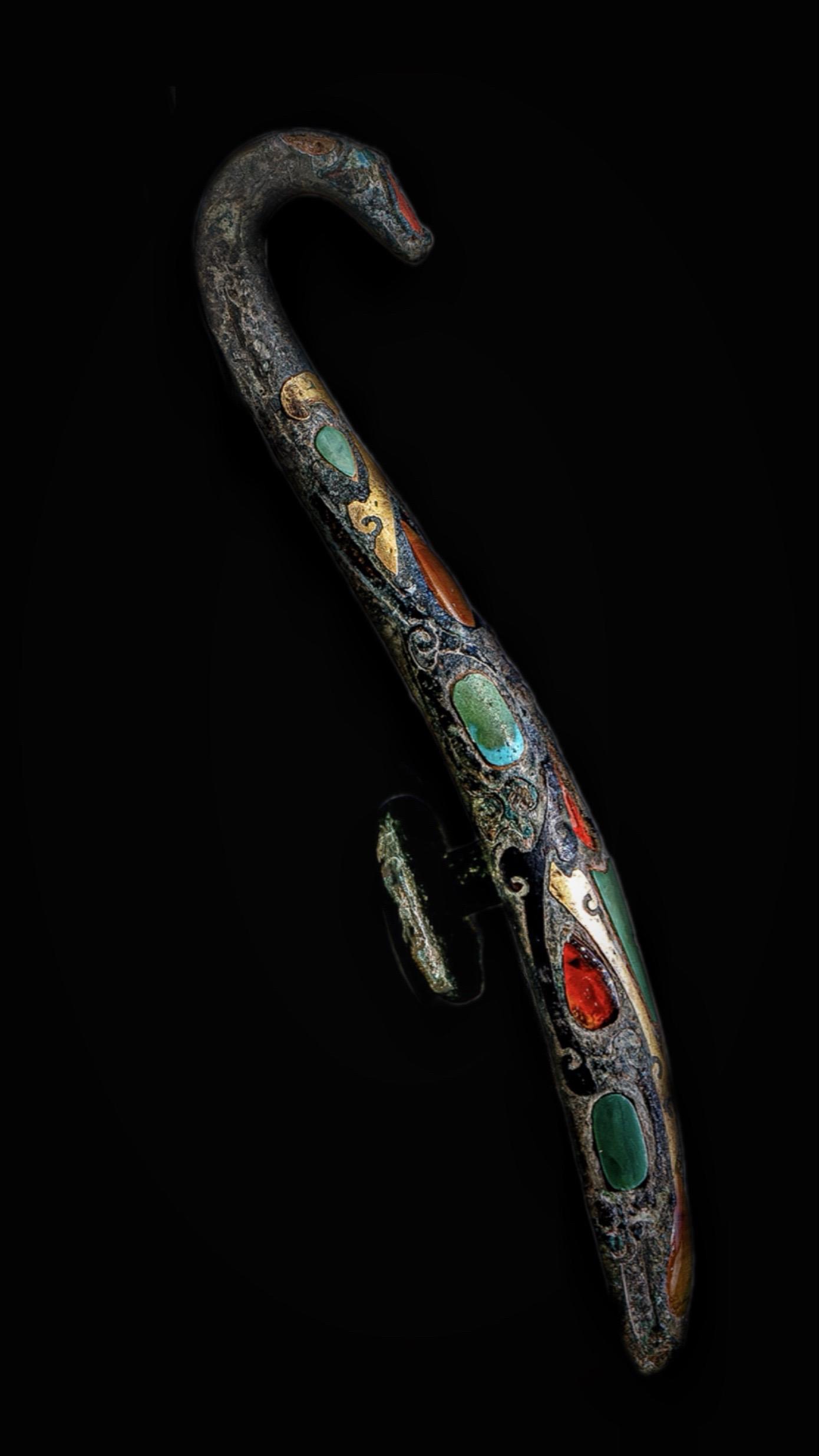 西汉·镶玛瑙绿松石鎏金铜带钩。天德悠且长,人命一何促