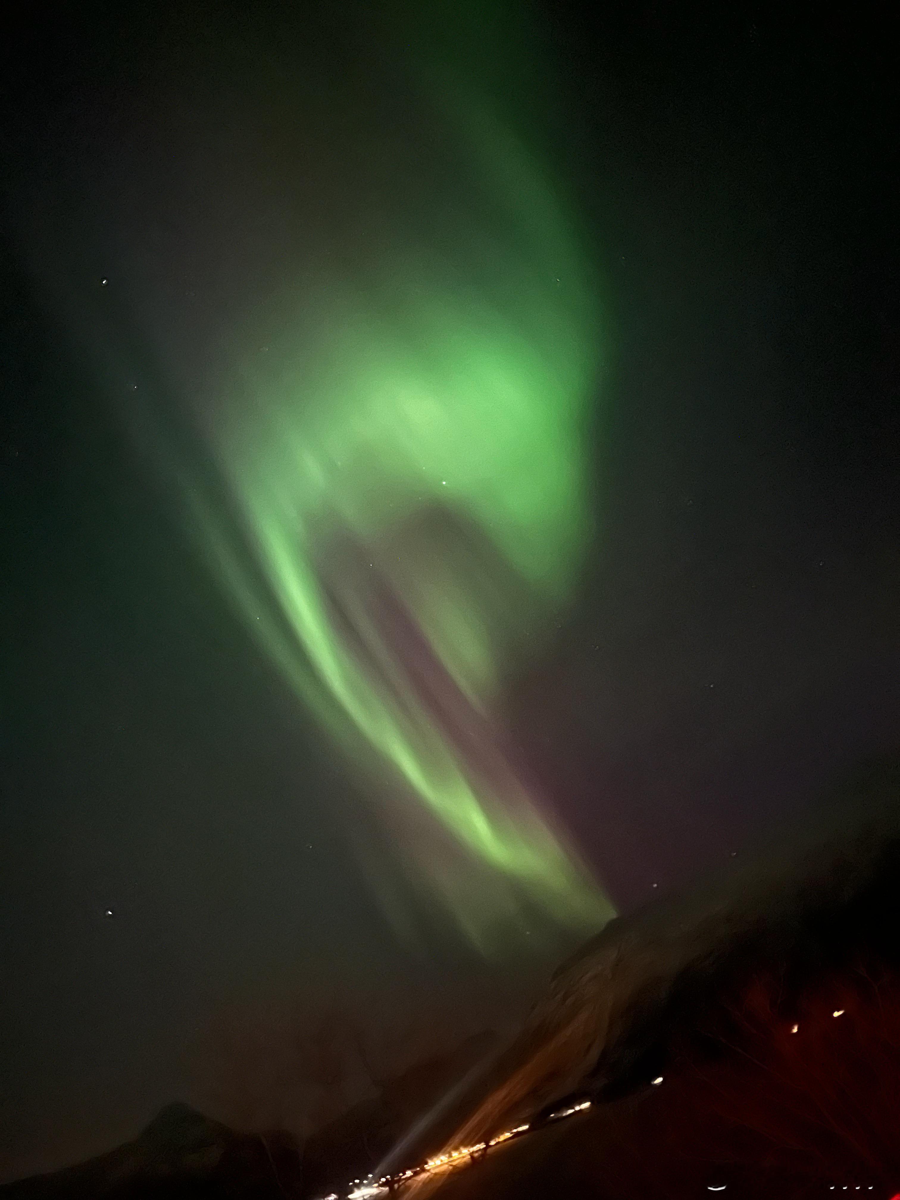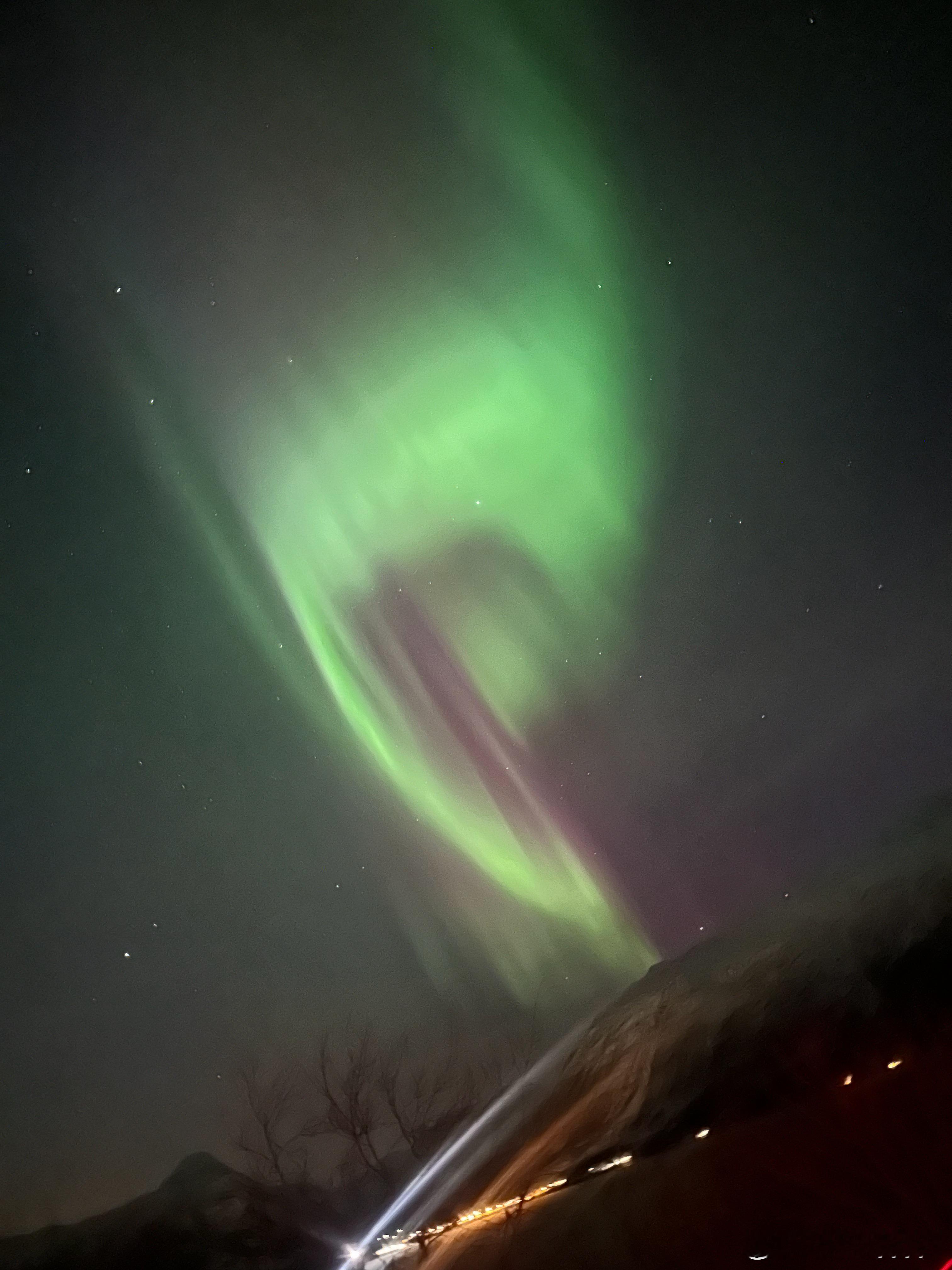 刚到挪威境内开着车赶路,抬头就看到了极光大爆发!持续时间久,变换快,五颜六色的,满天都是!视觉冲击很强!你要明白,好多人来这儿一周一次也没看到过极光。