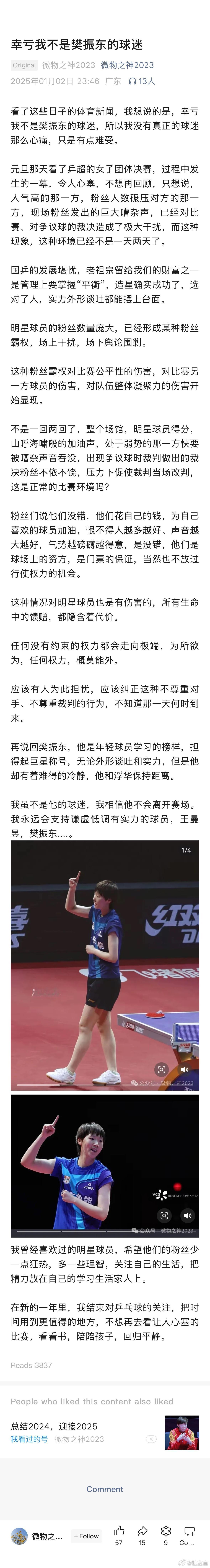 一位曾经的CP粉(两娃的家长,高中生和小学生)表示,新的一年将不再关注乒乓球。