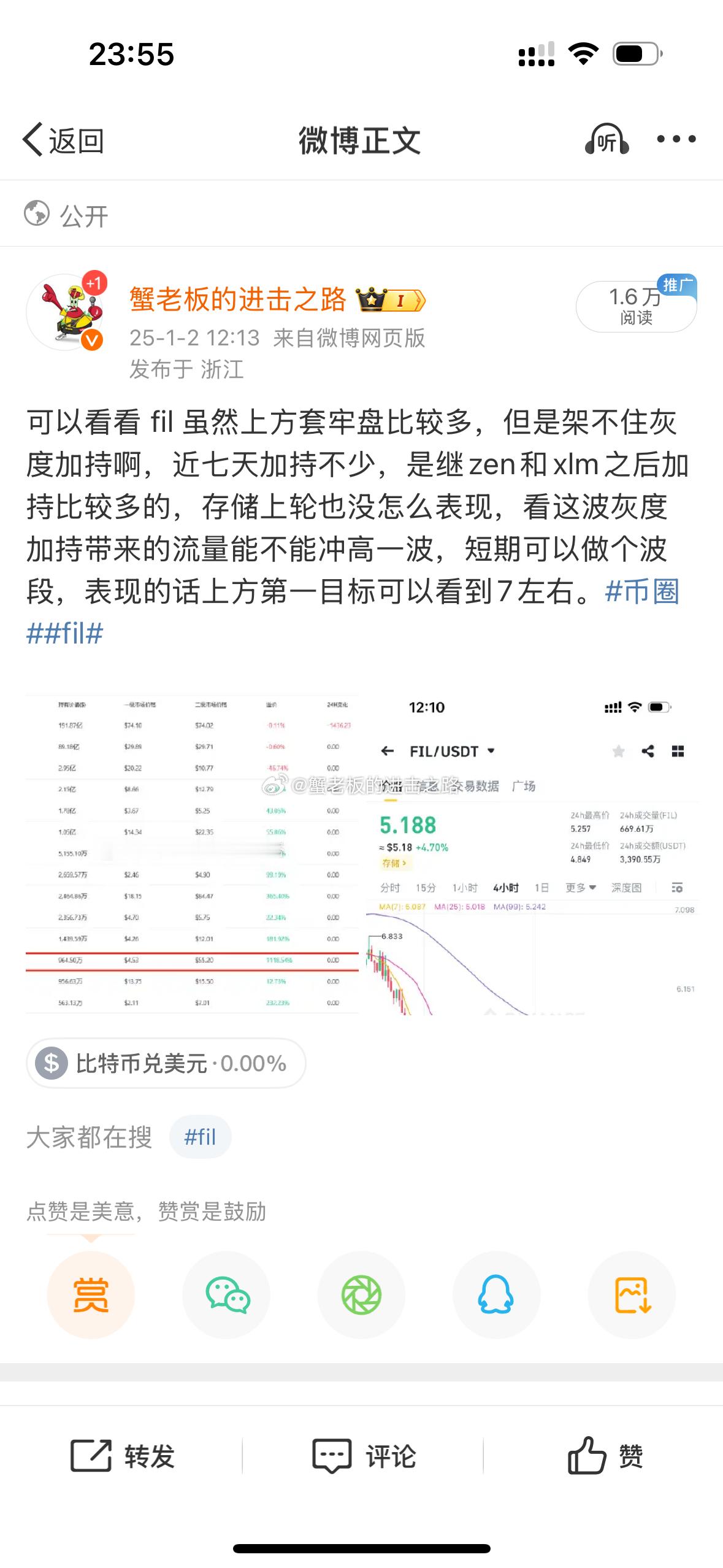 美股高开,大盘跟涨了一波,算是比较好的情况,但下周一是老美新年正式的第一天,希望有个好的开头,fil走的太慢了,才10%我觉得拿到7附近不是问题,有跟的继续拿着,今天某安的新B把市场的资金吸走了不少,很无奈,大盘走都拉起来了,山寨普遍还没有10%,继续持有[太开心][心]