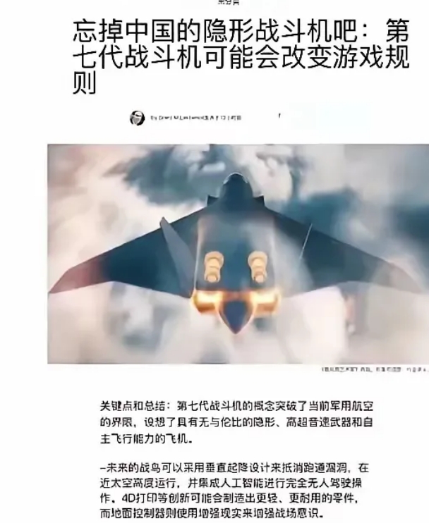 不过,我估计哈,等中国七代机出来了,美国可能又故技重演,连夜赶制出八代机效果图,然后发文称:“忘掉中国的隐形战斗机吧:第八代战斗机可能会改变游戏规则”。